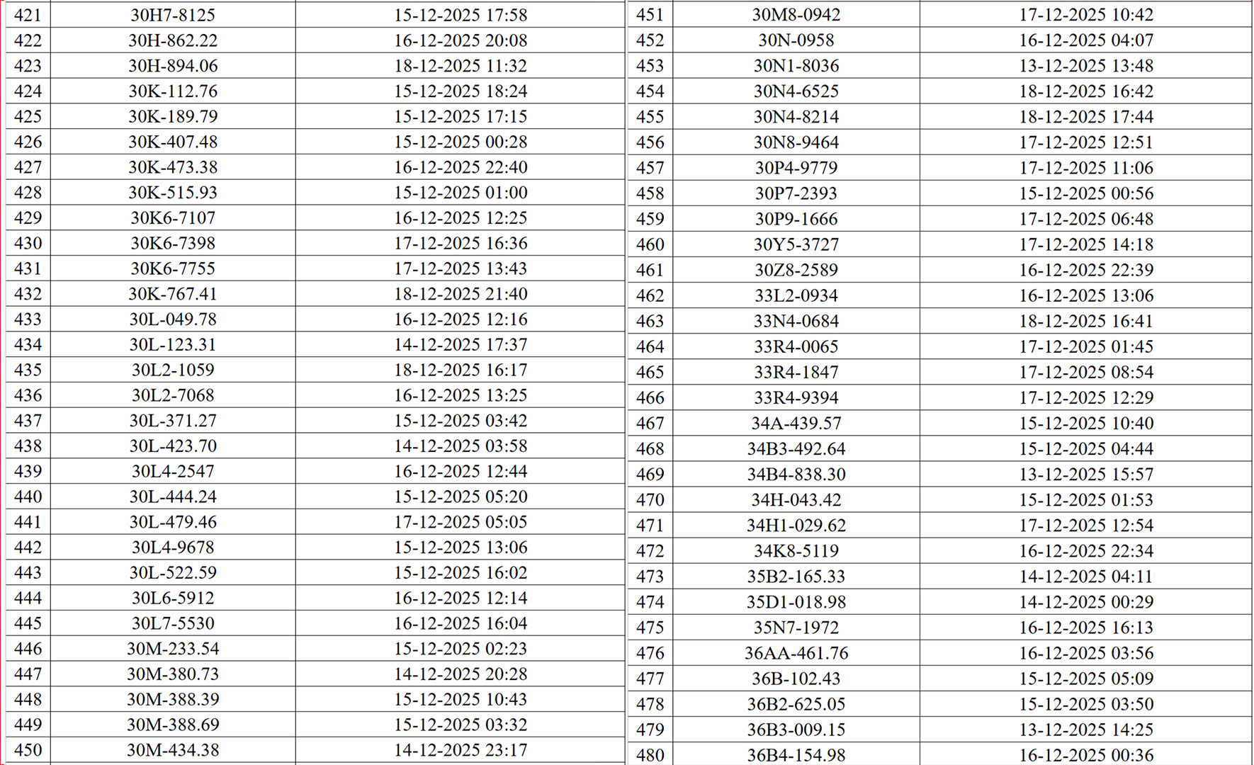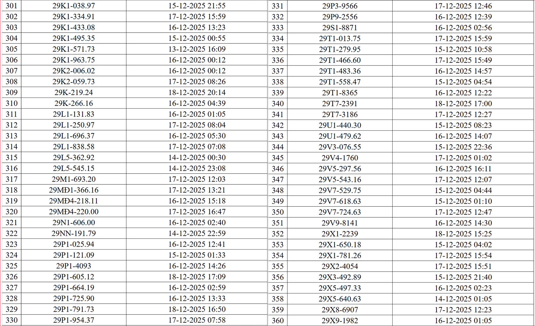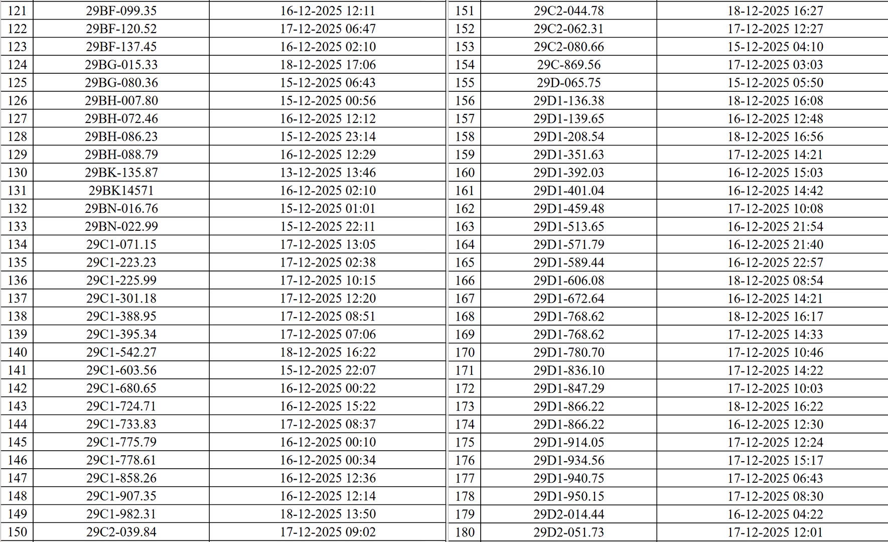 Công an TP Hà Nội tối 29/12 đã thông báo danh sách phương tiện vi phạm TTATGT được phát hiện qua hệ thống camera AI.