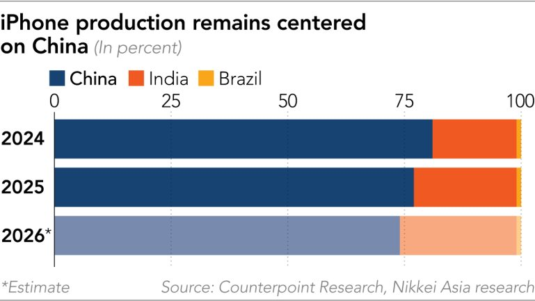 Dưới thời Tim Cook, Apple đã nỗ lực đa dạng hóa sản xuất để tăng cường khả năng chống chịu. Tuy nhiên, quá trình này đang cho thấy sự phức tạp và chậm chạp hơn dự kiến. Dữ liệu từ Counterpoint Research chỉ ra rằng, đến năm 2025, Ấn Độ mới chỉ chiếm khoảng 22% sản lượng iPhone và dự kiến chỉ tăng nhẹ lên 25% vào năm 2026.