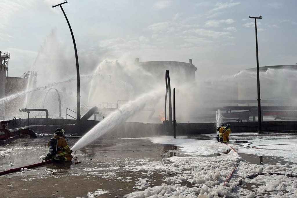 Hình ảnh do Bộ Nội vụ Bahrain công bố cho thấy lực lượng cứu hỏa đang dập lửa sau khi vật thể bay từ Iran bắn trúng khu công nghiệp ở Ma'ameer, Bahrain, ngày 9/3. (Ảnh: AP)