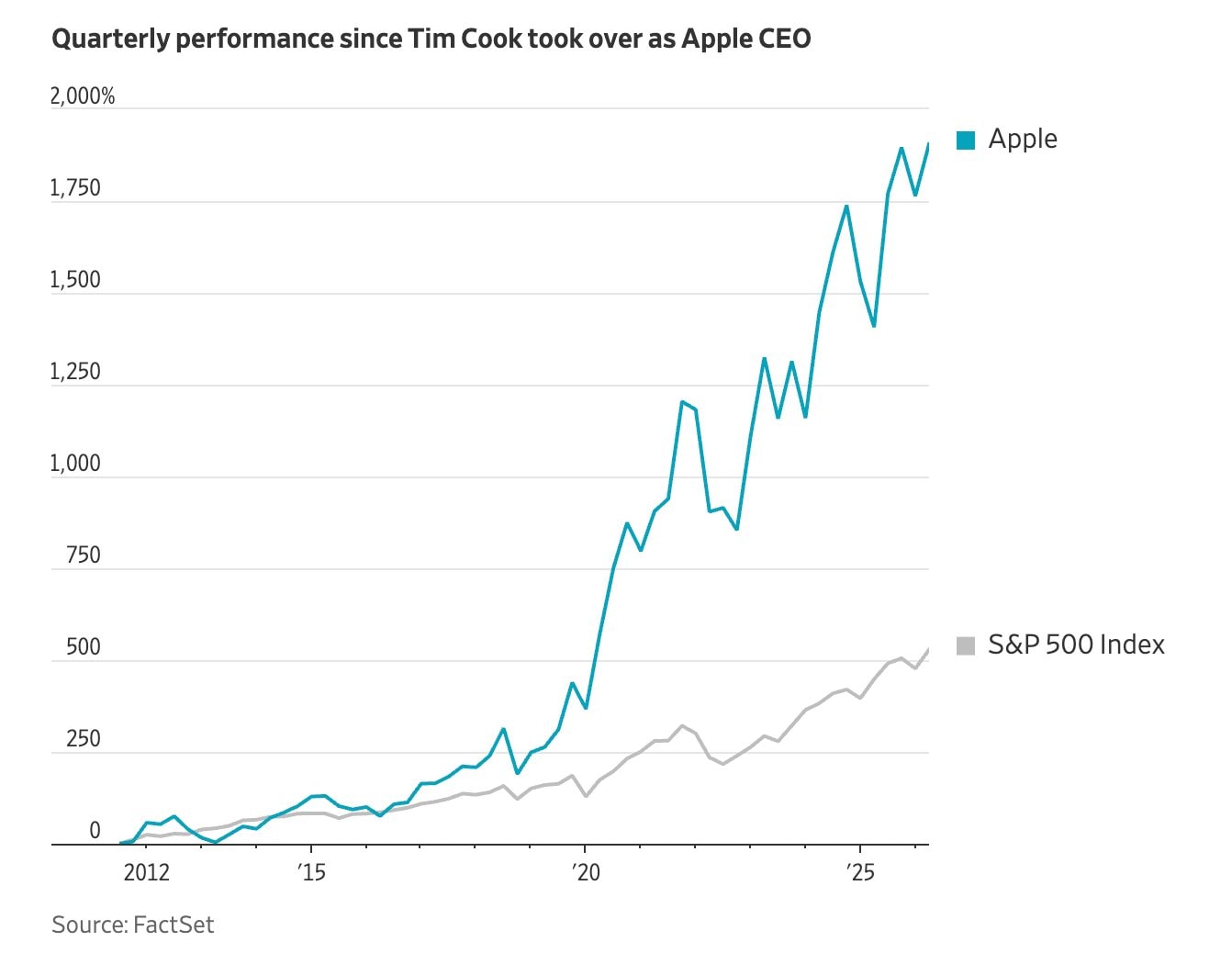 Tim Cook rời bỏ vị trí quyền lực nhất vào đúng thời điểm Apple đang ở trên đỉnh cao chói lọi: dòng sản phẩm chủ lực iPhone liên tục xô đổ các kỷ lục doanh số, vốn hóa thị trường vượt ngưỡng 4.000 tỷ USD và doanh thu cán mốc hơn 400 tỷ USD, gấp 4 lần so với thời điểm ông tiếp quản 15 năm trước.