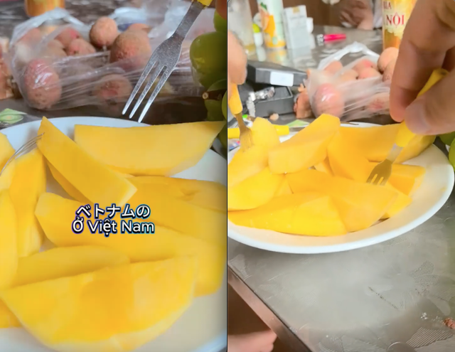 Loại trái cây đó chính là xoài. Anh chàng sau khi ăn đã chia sẻ bằng tiếng Việt một cách đầy cảm xúc: "Ngọt xỉu luôn. Đúng là xoài chuẩn xịn của Việt Nam."