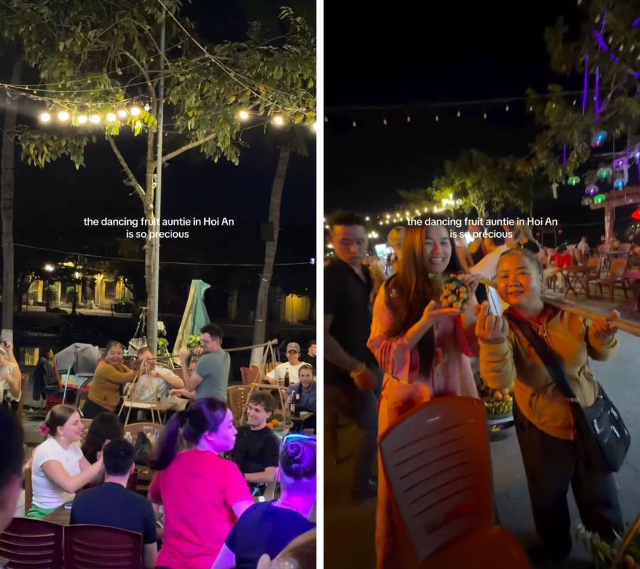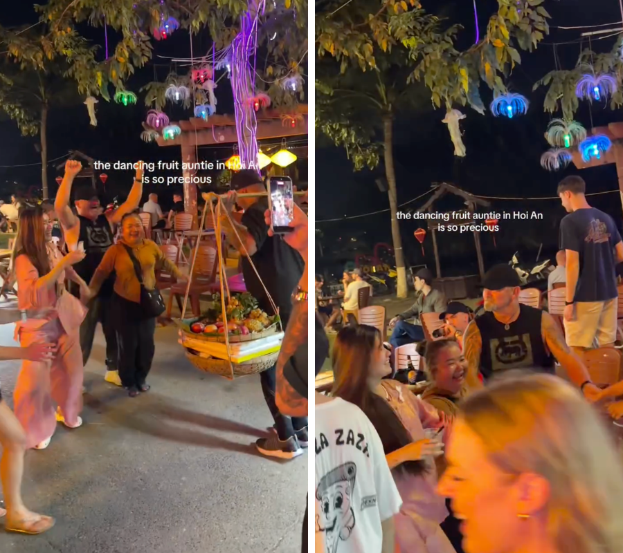 Đoạn video ghi lại cảnh một cô gánh rong, với nụ cười rạng rỡ, đang nhảy múa nhiệt tình cùng một nhóm du khách nước ngoài ngay trên đường phố Hội An về đêm. Âm nhạc sôi động, không khí vui tươi, cô không ngần ngại thể hiện những điệu nhảy tự nhiên, đầy sức sống.
