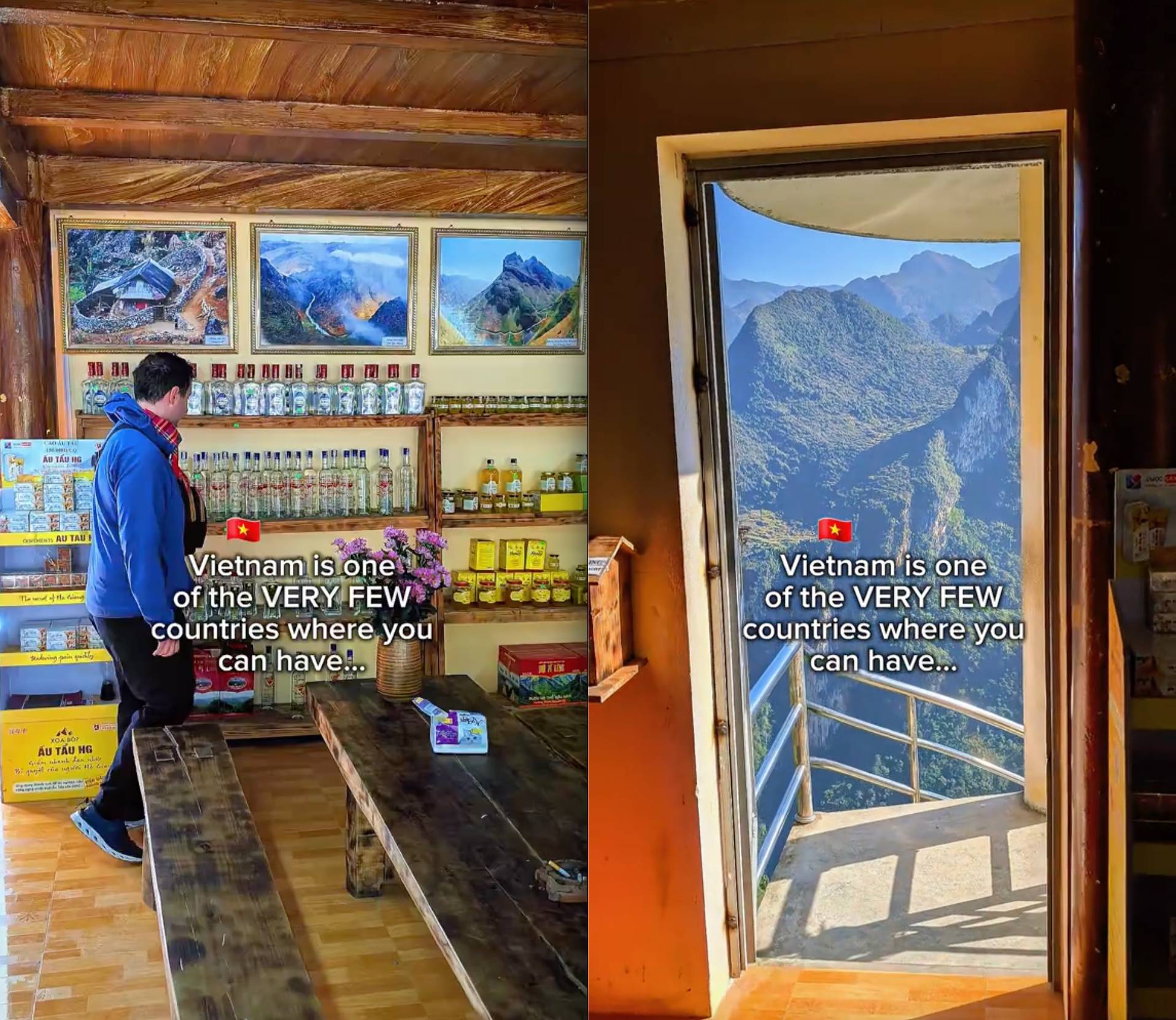 Theo đó, 2 vị khách Tây này đang ngồi uống cà phê tại một địa điểm du lịch nổi tiếng ở Hà Giang cũ (nay thuộc Tuyên Quang). Chỉ cần gọi một ly cà phê có giá 1USD (khoảng 26.000 đồng), họ đã có thể ngồi trên cao, phóng tầm mắt ra xa và thu trọn vào tầm nhìn khung cảnh núi rừng hùng vĩ. Trước mắt là những dãy núi trùng điệp nối tiếp nhau, phía dưới là dòng sông xanh ngắt uốn lượn mềm mại như một dải lụa, tất cả tạo nên một bức tranh thiên nhiên vừa hoang sơ vừa thơ mộng.