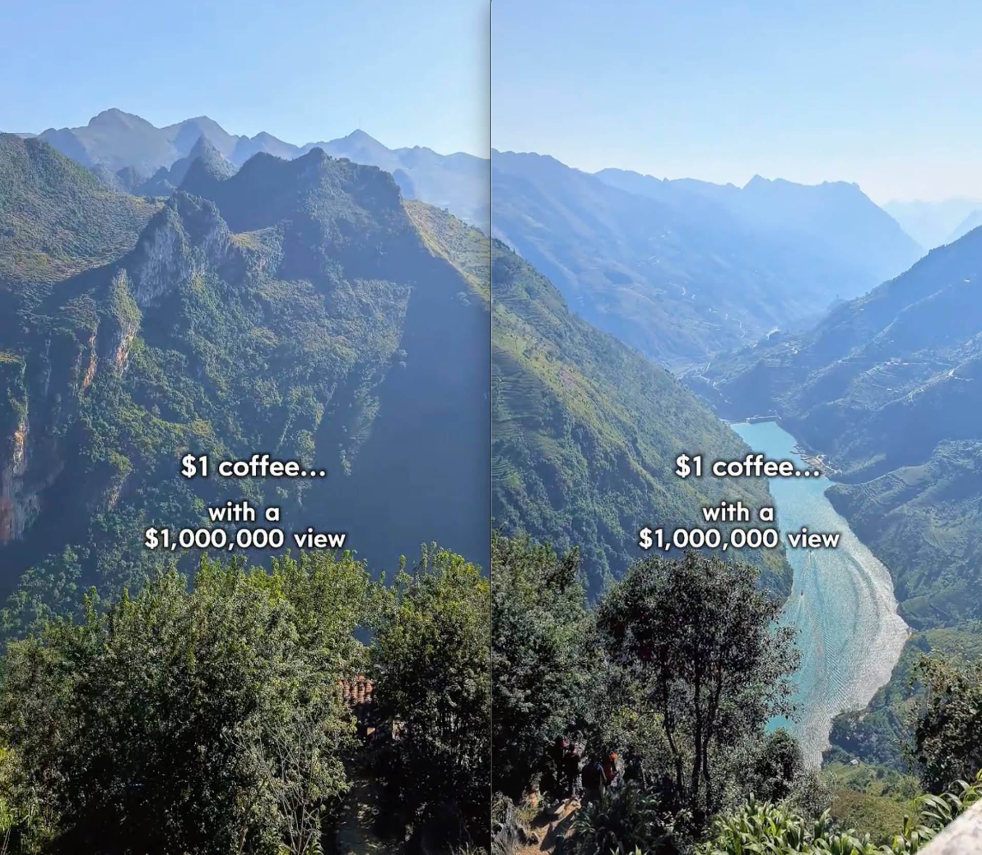 Mới đây, 2 vị khách Tây đã chia sẻ trải nghiệm của mình trên mạng xã hội và nhanh chóng thu hút sự chú ý. 2 vị khách này cho biết: "Việt Nam là một trong những nước hiếm hoi mà bạn có thể mua ly cà phê 1 USD mà nhận được view triệu đô." Câu nói ngắn gọn nhưng đủ khiến nhiều người gật gù đồng tình, bởi hình ảnh trong video đúng là khó tin.