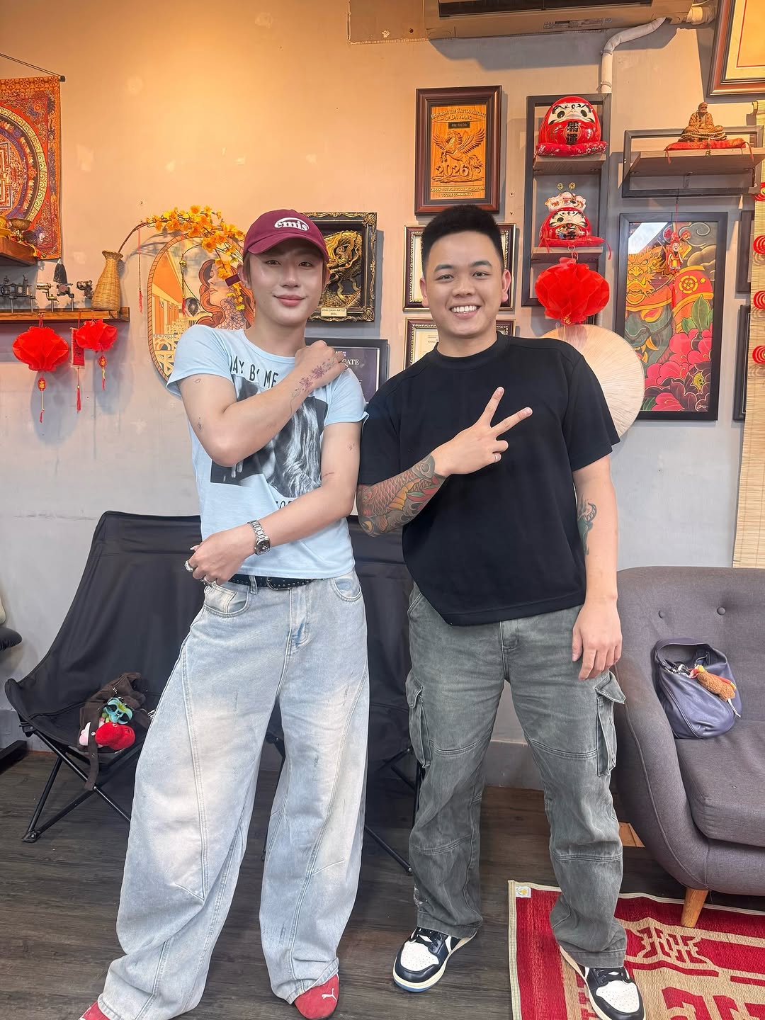 Hình ảnh nam du khách chụp ảnh cùng người đã xăm hình cho mình. Ảnh: @foofoam.m