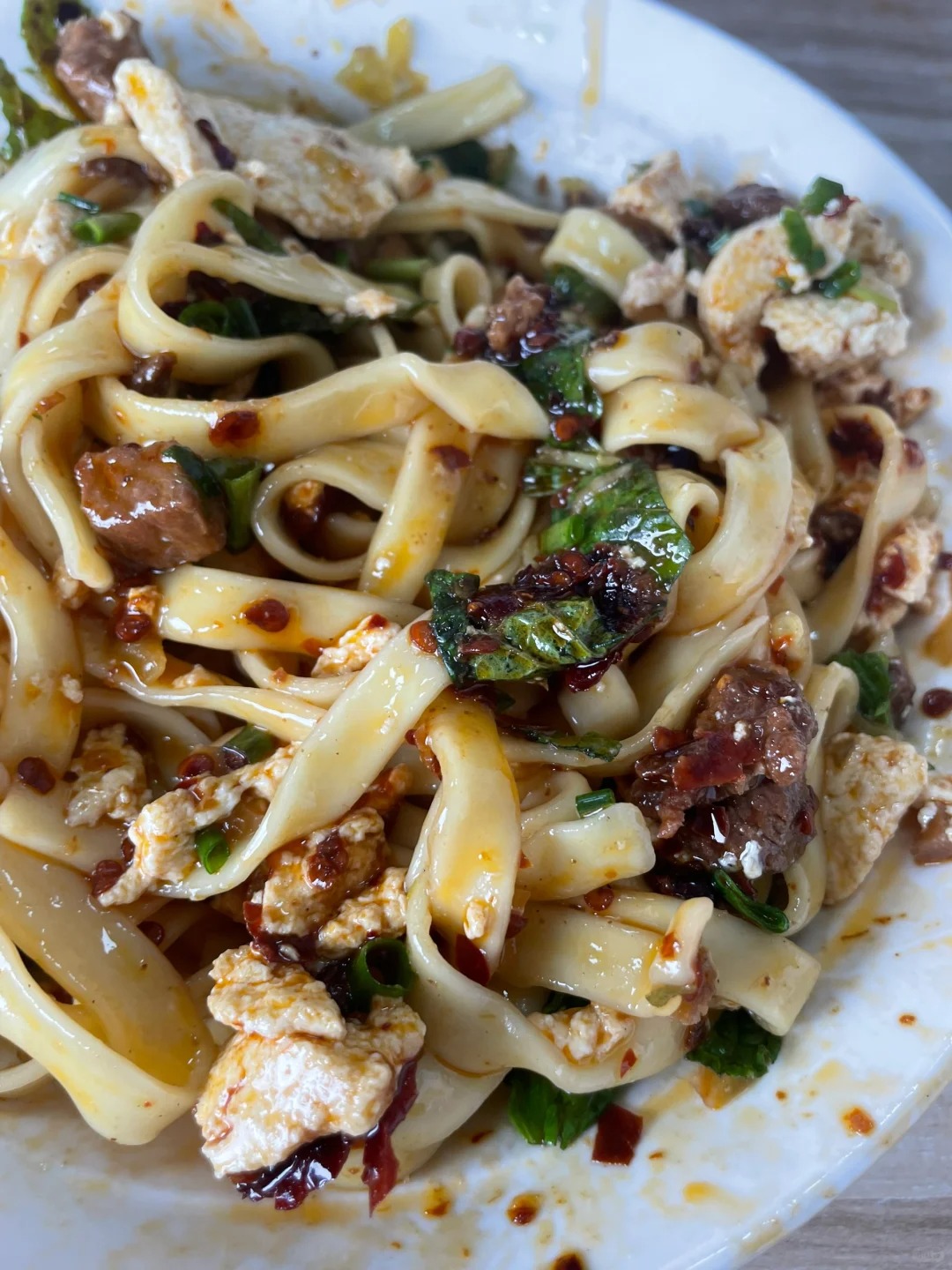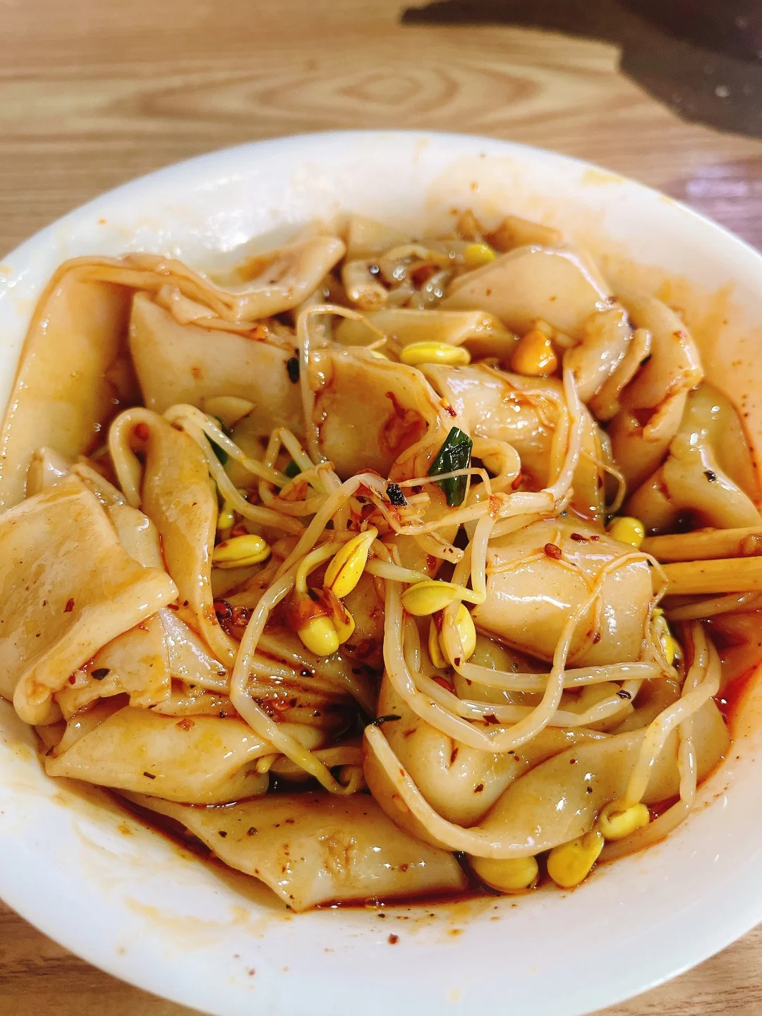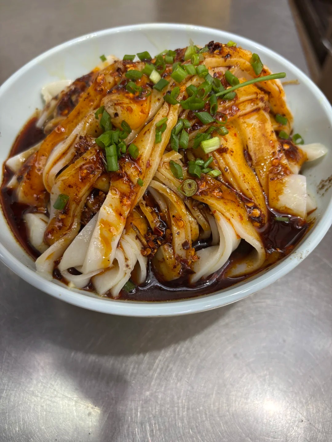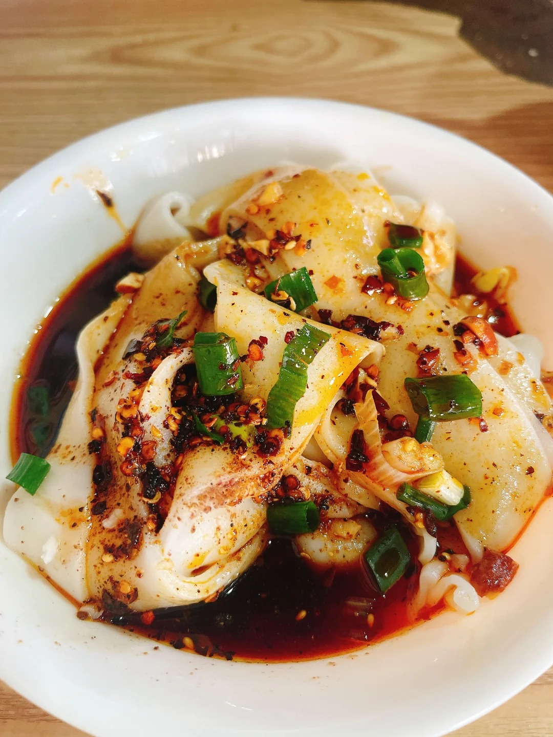 Từng sợi mì dai mềm, nẩy búng, ăn vào miệng có độ dẻo thơm khó tả. Dù mang tên "mì lạnh", nhưng thực chất đây là món ăn ấm nóng, bột gạo vừa tráng xong còn bốc khói, rưới thêm chút gia vị, càng trộn càng dậy mùi thơm lừng. Cảm giác xì xụp bát mì này khá giống với việc thưởng thức một bát phở trộn đậm đà của Việt Nam, nhưng phiên bản Tứ Xuyên lại rực rỡ hơn với sắc đỏ của dầu ớt.