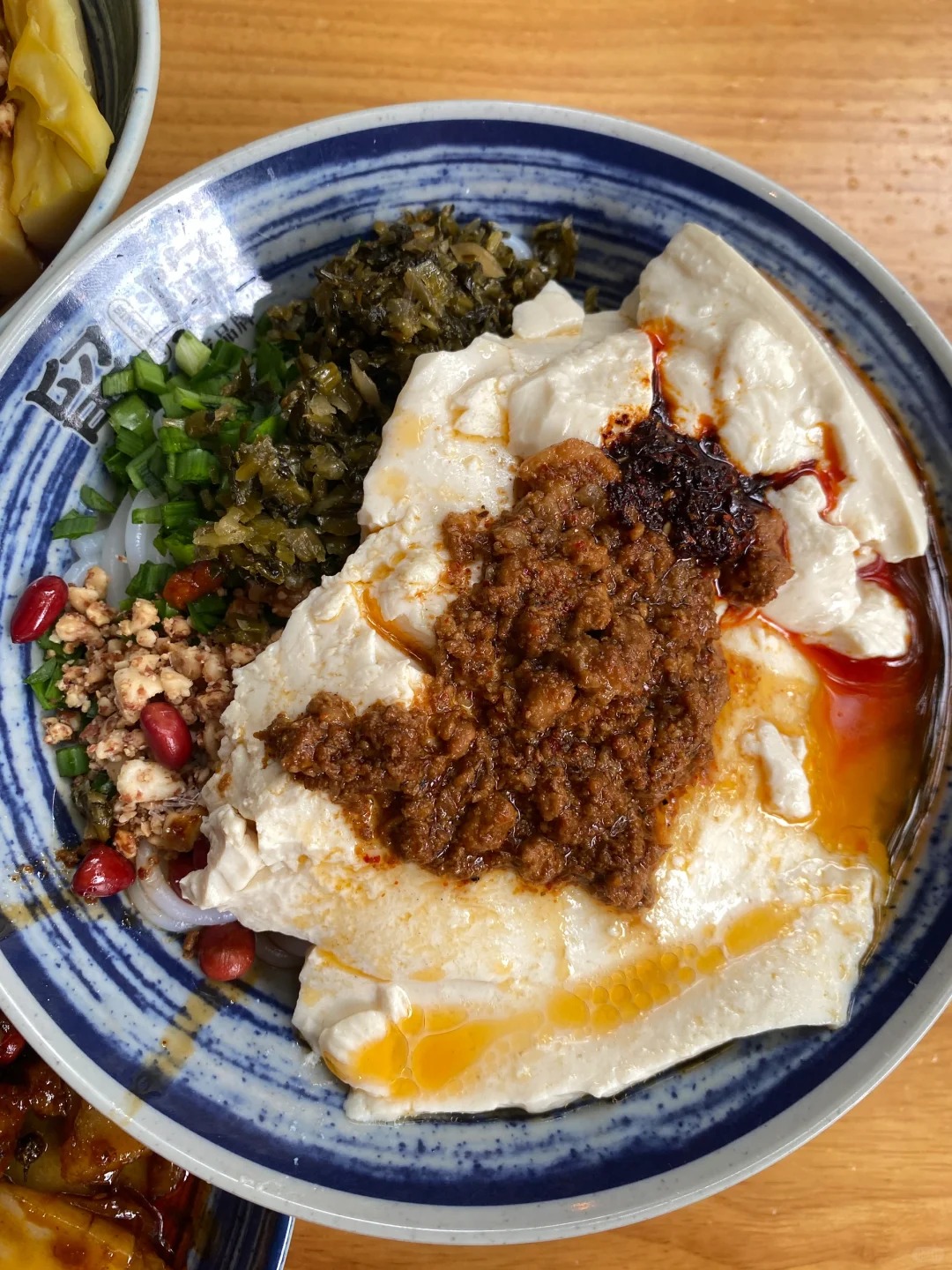 Nếu mì lạnh là sự bùng nổ thì cháo gạo tào phớ dưa muối ở vùng Tăng Gia Sơn lại là "nhân tố ôn hòa" của bữa sáng Quảng Nguyên. Từng lớp hạt gạo lứt, dưa cải muối chua và tào phớ mềm mịn được xếp chồng lên nhau, ninh nhỏ lửa cho đến khi sánh quyện. Hương thơm mộc mạc của gạo đồng hòa lẫn với vị chua thanh tao của dưa muối, ăn một miếng là thấy hơi ấm lan tỏa khắp cơ thể, xua tan đi cái lạnh buổi sớm của vùng Xuyên Bắc. Bạn sẽ thấy món này thoang thoảng nét hiền hòa của bát tào phớ hay bát cháo sườn nhuyễn mịn ở Việt Nam, nhưng lại mang một cá tính rất riêng nhờ vị dưa cải đặc trưng.