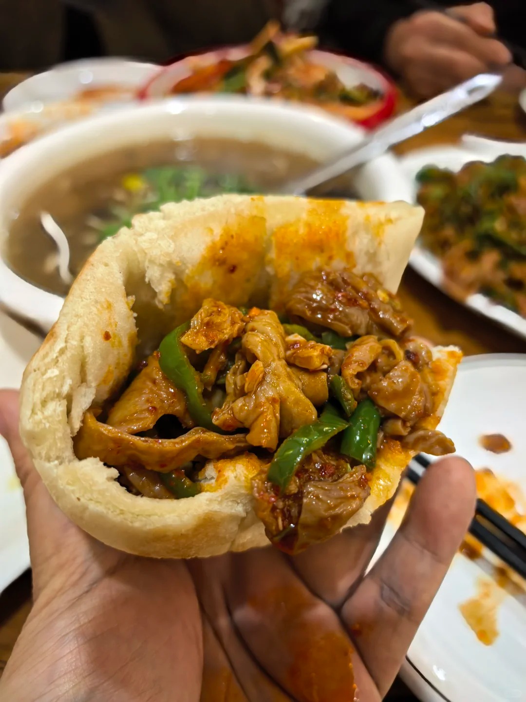 Bí kíp ăn chuẩn dân bản địa: Hãy mạnh dạn xin cô chủ rưới thêm một thìa nước sốt hầm để bánh thấm đẫm vị đậm đà, kẹp thêm chút củ cải chua thái hạt lựu cho sảng khoái. Bánh nhất định phải chọn loại nướng giòn rụm, khi nhai cùng miếng lòng béo ngậy sẽ tạo nên tiếng "rôm rốp" cực kỳ vui tai.