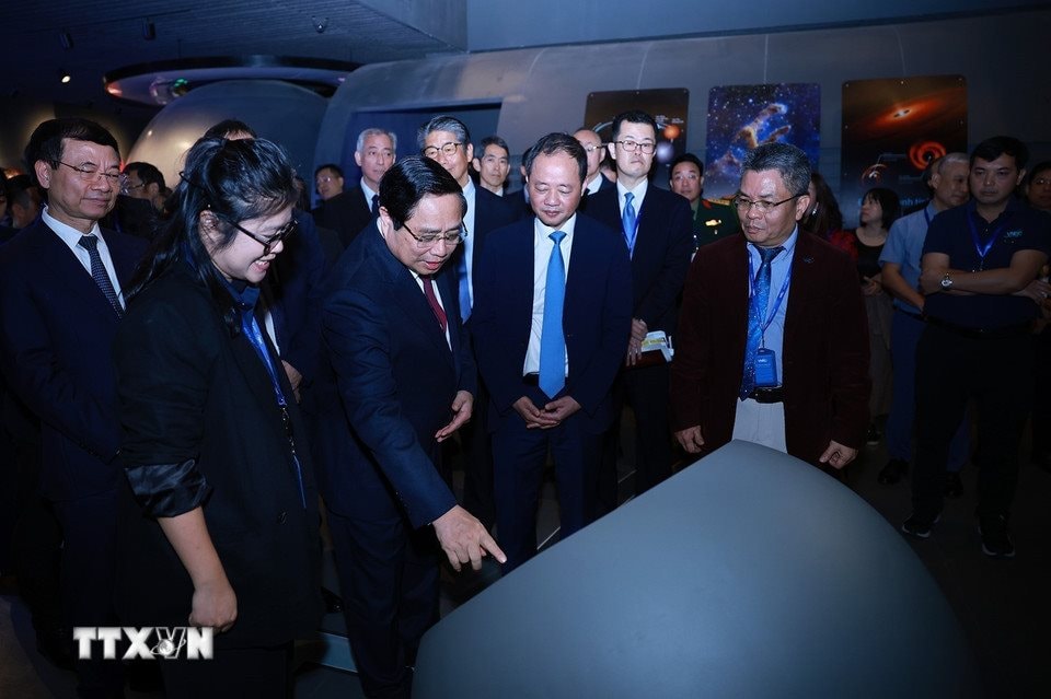 Thủ tướng và các đại biểu tham quan Bảo tàng Vũ trụ Việt Nam. Ảnh: TTXVN
