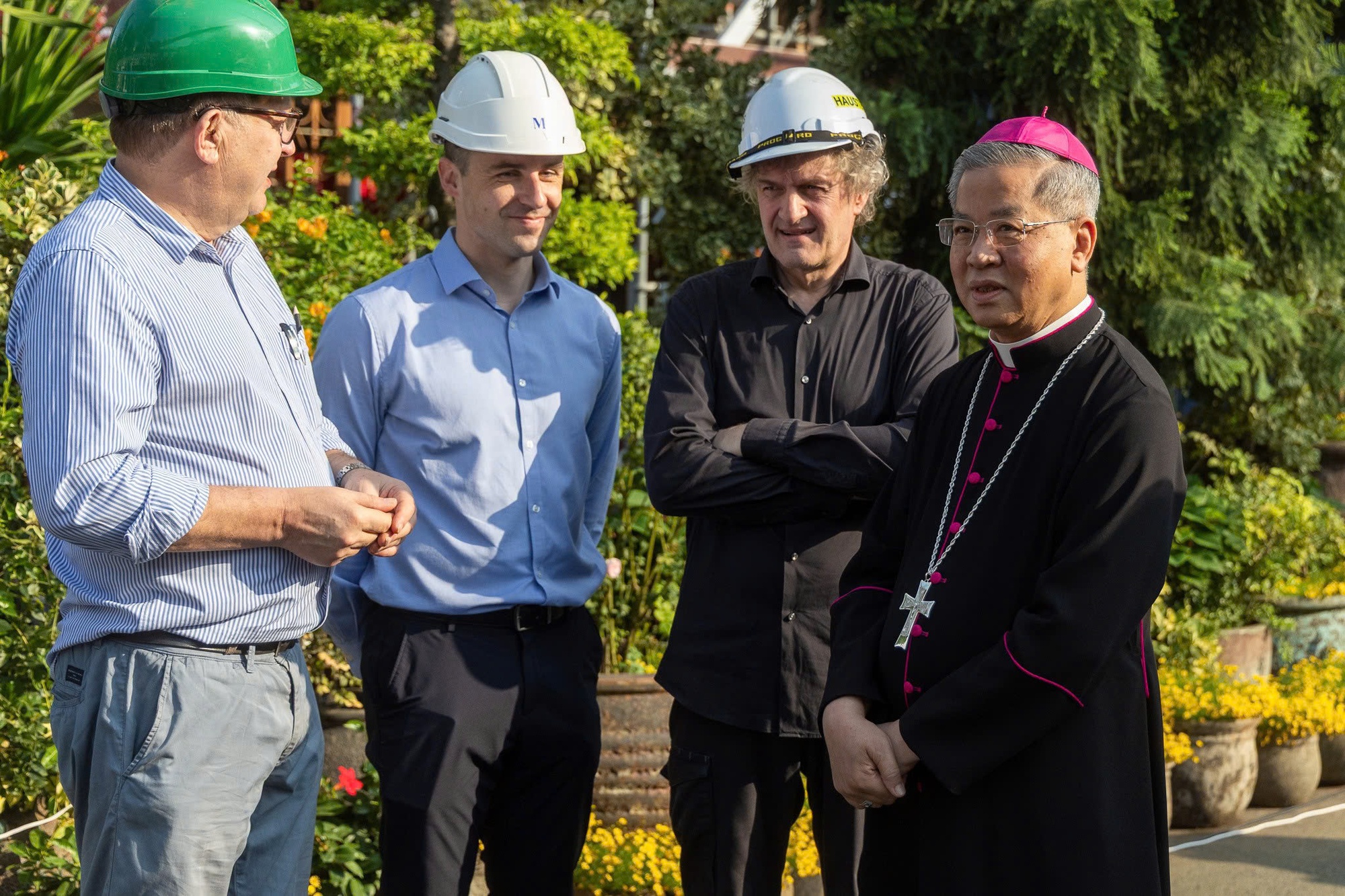 Đức cha Giuse Nguyễn Năng - Tổng giám mục Tổng giáo phận TP.HCM và Đức cha Marek Zalewski - đại diện Tòa thánh thường trú tại Việt Nam trao đổi, đọc kinh cầu nguyện, làm phép trước khi cẩu hai thánh giá lên cao.