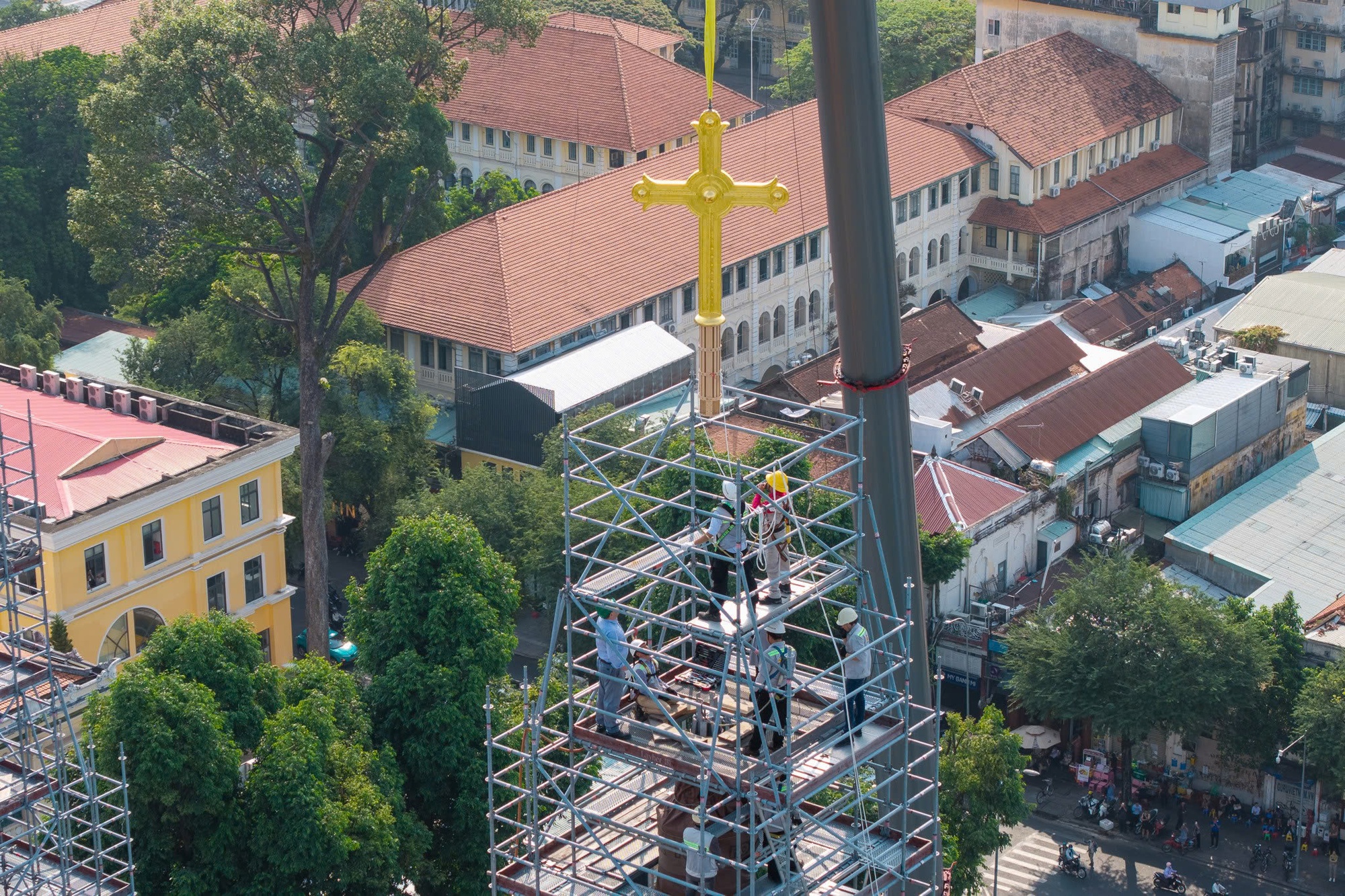Sáng 19/3, tại Nhà thờ Đức Bà Sài Gòn, hai Thánh giá mạ vàng nặng 400kg được lắp lên đỉnh tháp, đánh dấu cột mốc quan trọng trong quá trình đại trùng tu công trình biểu tượng hơn 140 năm tuổi của TP.HCM.