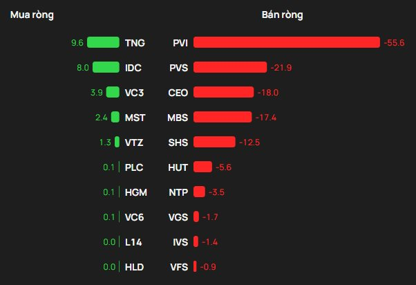 Tại chiều mua, TNG được mua ròng mạnh nhất với giá trị 10 tỷ đồng. Bên cạnh đó, IDC xếp tiếp theo trong sách mua ròng mạnh trên HNX với 8 tỷ đồng. Ngoài ra, khối ngoại cũng chi vài tỷ đồng để gom ròng VC3, MST, VTZ.