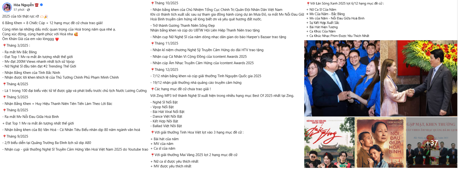 Nếu phải chọn một cụm từ để mô tả 2025 của Hòa Minzy, có lẽ “rực rỡ” vẫn chưa đủ. Trên trang cá nhân, nữ ca sĩ công bố bản tổng kết cuối năm với loạt con số ấn tượng: 6 bằng khen, 8 chiếc cúp cùng 12 hạng mục đề cử “chưa trao giải”. Không chỉ là một mùa bội thu giải thưởng, đây còn là năm Hòa Minzy tạo ra những điểm chạm hiếm có giữa âm nhạc – văn hóa – cộng đồng, và đặc biệt là những cột mốc lan tỏa vượt ra ngoài biên giới thị trường giải trí trong nước.