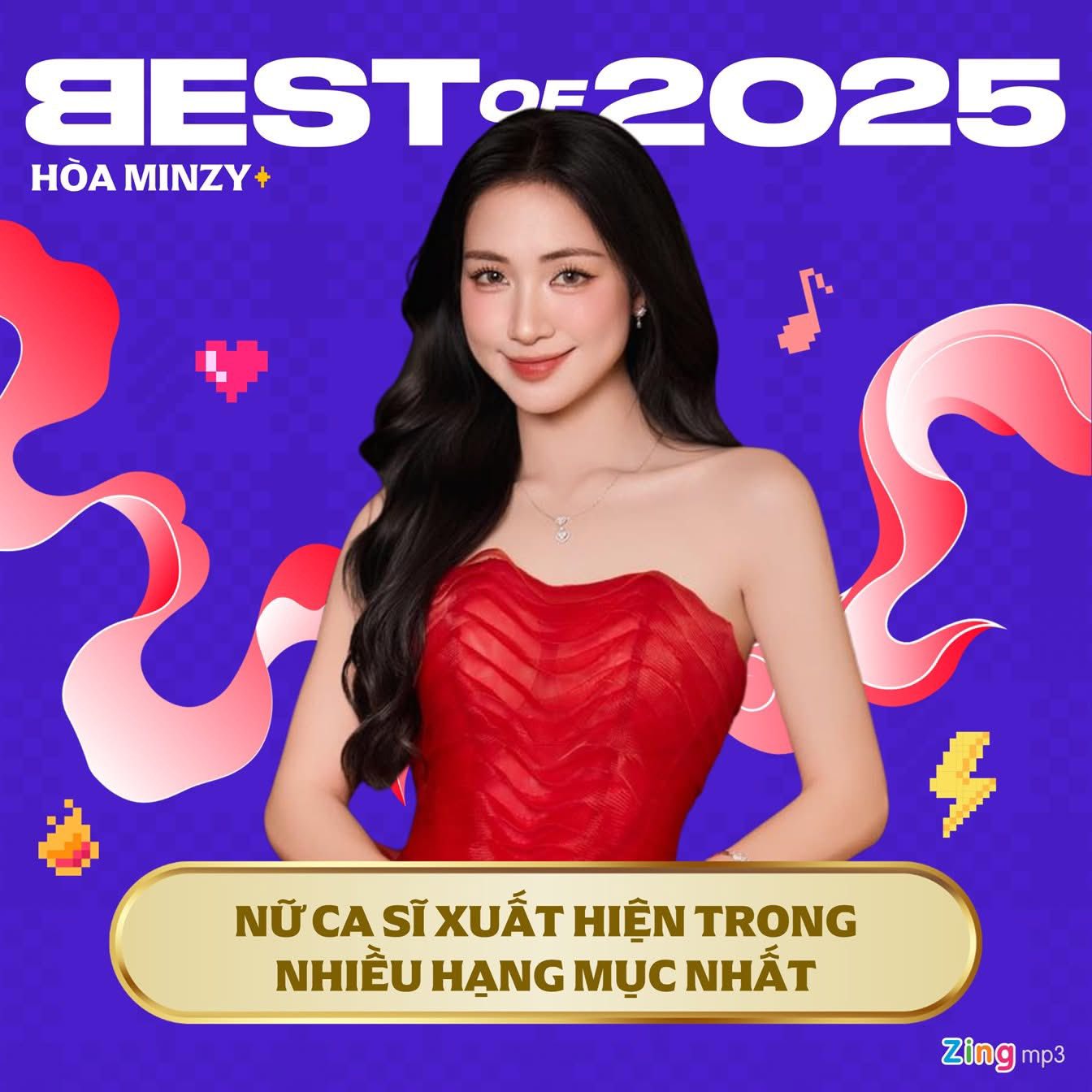 Đáng nói, hành trình 2025 của Hòa Minzy vẫn chưa khép lại ở danh sách giải đã nhận. Trên Zing MP3, cô là nghệ sĩ xuất hiện trong nhiều hạng mục Best Of 2025 nhất, trải rộng từ “Nghệ sĩ nổi bật”, “Vpop nổi bật” đến các nhóm “viral”, “dance”, “kết hợp”, “ballad”. Bên cạnh đó là các đề cử tại Tinh Hoa Việt (Bài hát của năm, MV của năm, Ca sĩ của năm), Mai Vàng 2025 (Nữ ca sĩ được yêu thích nhất, MV được yêu thích nhất) và Làn Sóng Xanh 2025 với loạt hạng mục quan trọng, bao gồm cả hai đề cử MV của năm cho “Bắc Bling” và “Nỗi Đau Giữa Hoà Bình”.