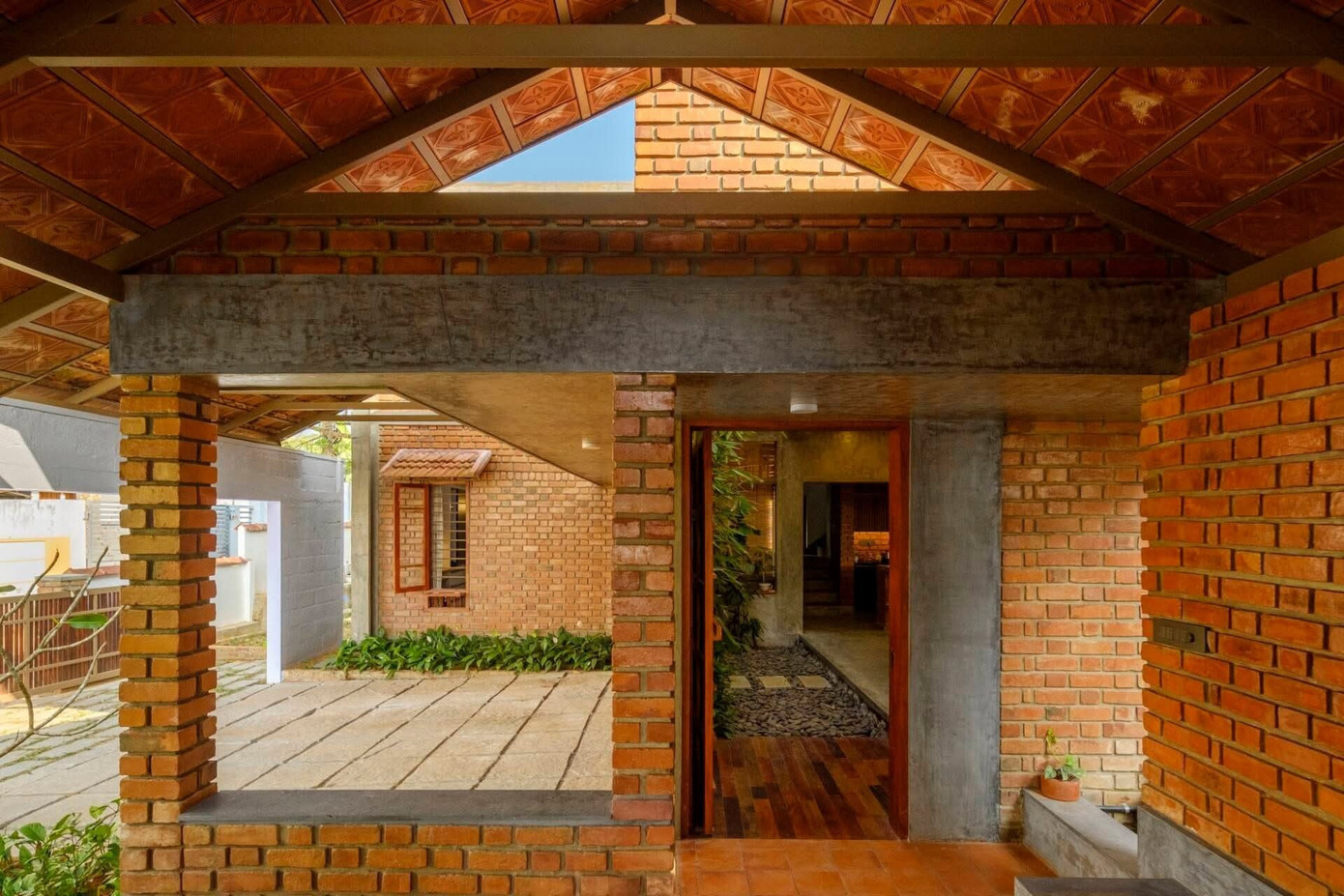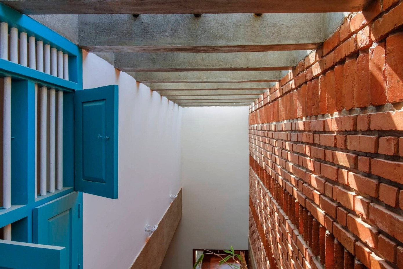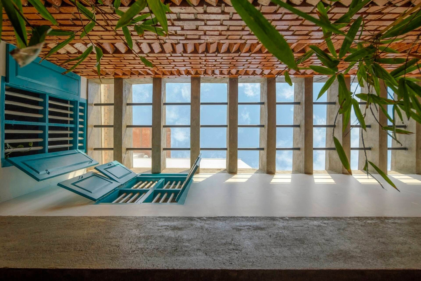 Công trình được bao bọc bởi các bức tường gạch mộc, các không gian sinh hoạt chung được mở rộng, liên kết với sân vườn và giếng trời để đón nắng gió suốt ngày dài.