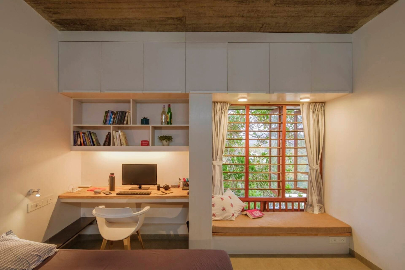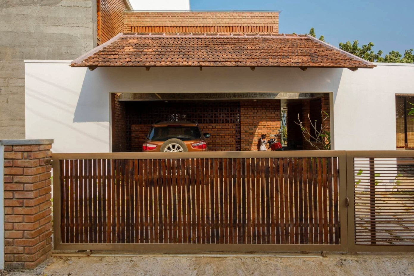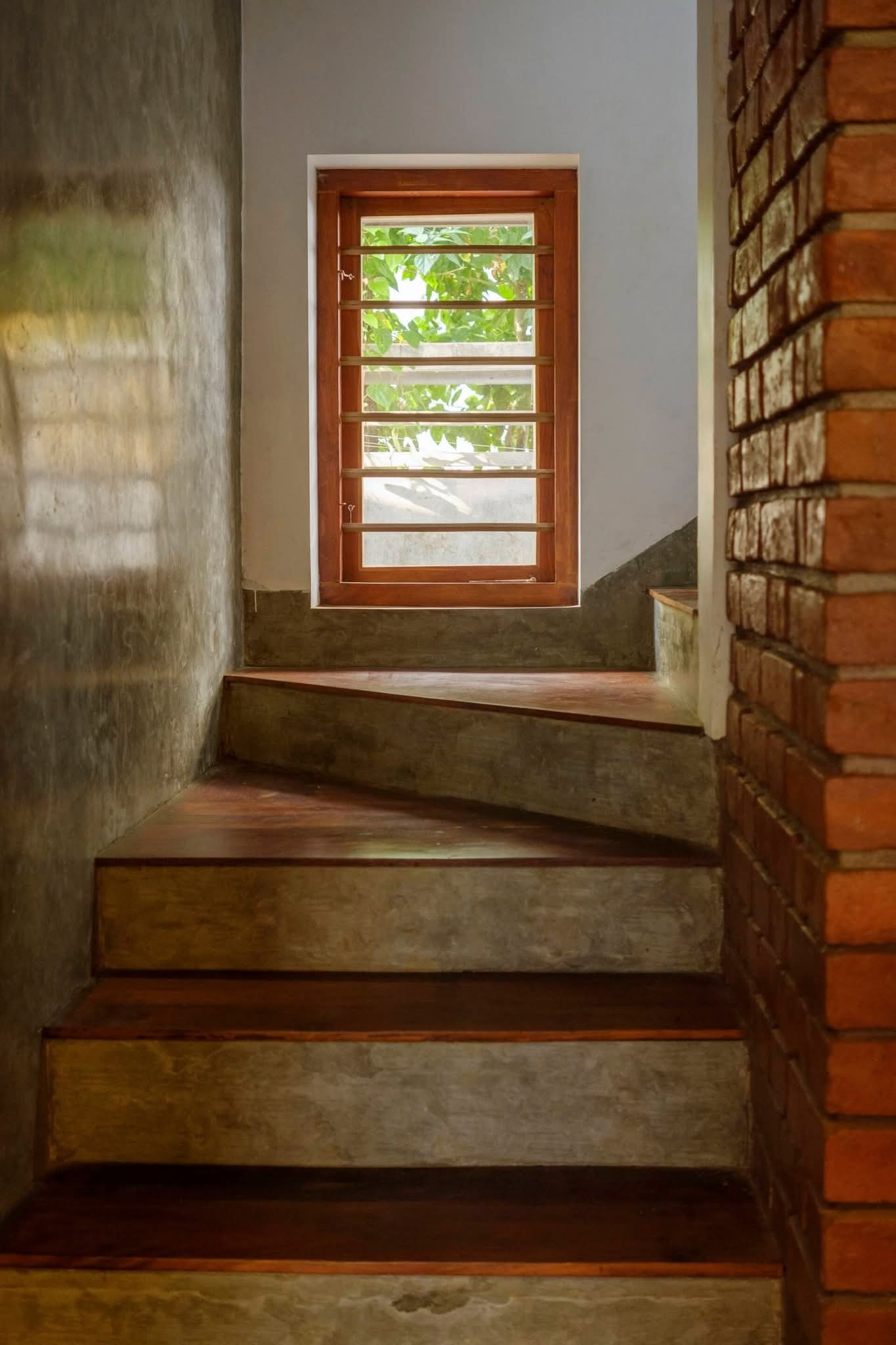 Công trình được bao bọc bởi các bức tường gạch mộc, các không gian sinh hoạt chung được mở rộng, liên kết với sân vườn và giếng trời để đón nắng gió suốt ngày dài.