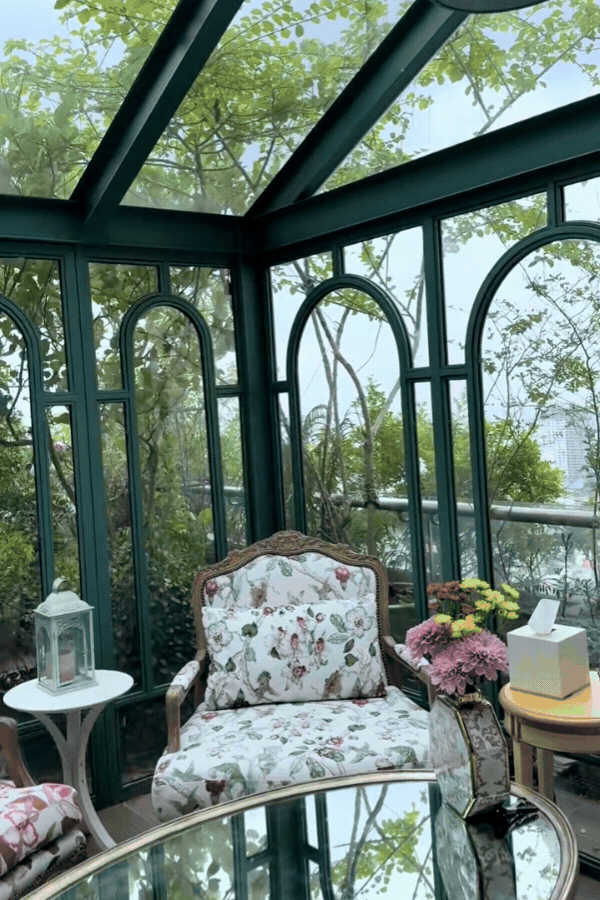 Phần đáng tiền nhất của khu vườn có lẽ là phòng trà kính. Khu vực này được thiết kế theo phong cách cổ điển, sang trọng, ngồi xuống là nhìn thấy cây, thấy nắng, thấy mọi thứ chậm lại. Giữa một không gian nhiều cây cối như vậy, phòng trà là nơi gia đình Hannah buông hết lo toan để "chill" và tận hưởng khu vườn của mình. Đây cũng là nơi mà người đẹp thường xuyên mời bạn bè về tụ tập, thưởng trà.