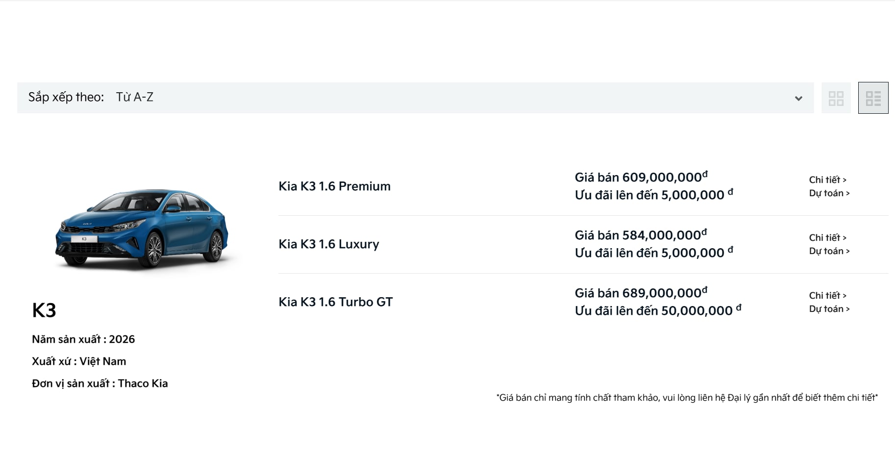 Website Kia Việt Nam cho thấy mẫu K3 chỉ còn 3 phiên bản. Ảnh chụp màn hình