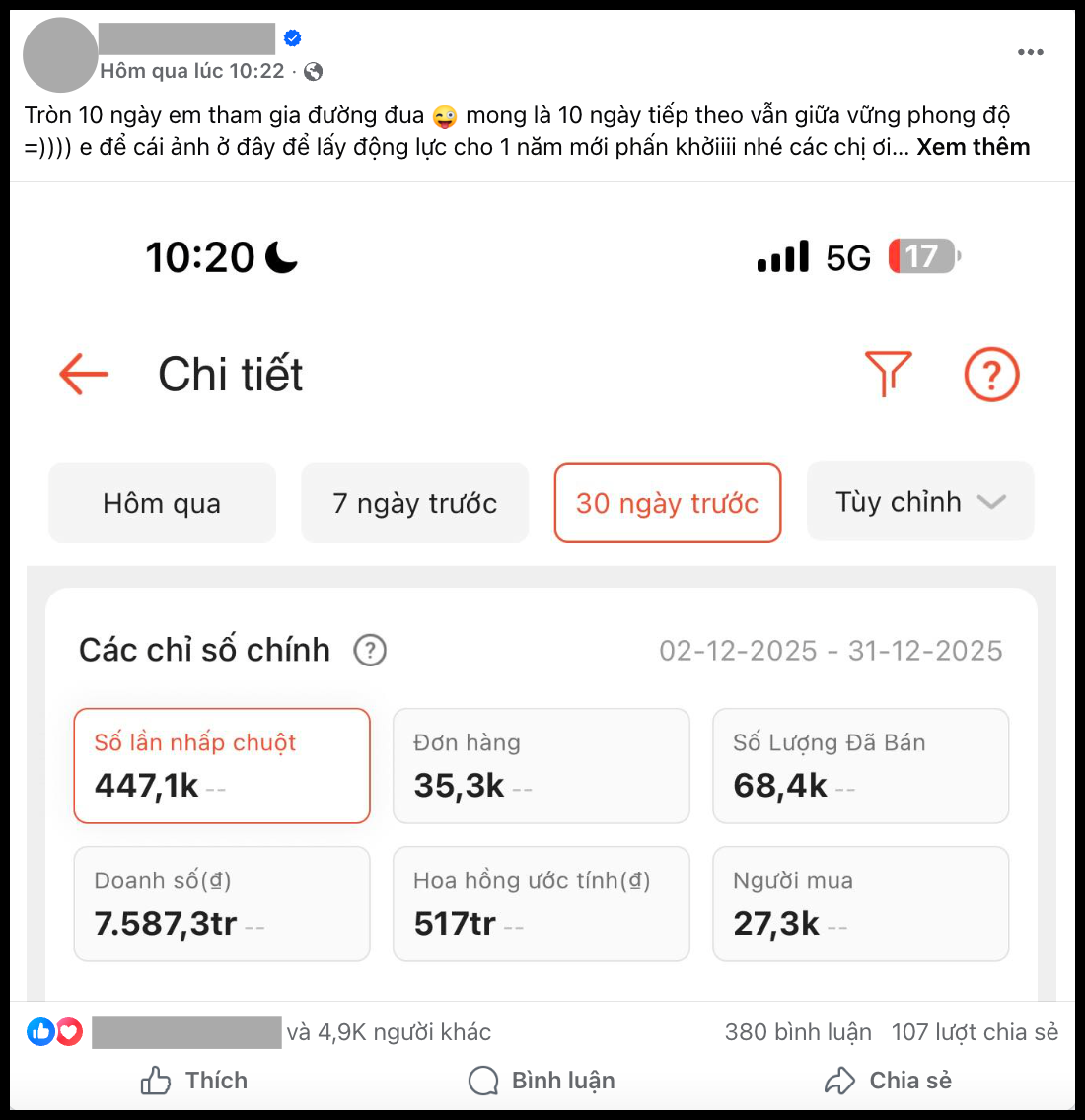 Hot girl P. gây chú ý khi chia sẻ chỉ trong 10 ngày tham gia “đường đua affiliate” tháng 12/2025 đã bán hơn 35.000 đơn hàng, tạo doanh thu gần 7,6 tỷ đồng và thu về 517 triệu đồng tiền hoa hồng. Hay một trường hợp khác, “bà trùm” bán hàng online N. cũng khoe chỉ riêng ngày 1/1/2026 đã bán 560 đơn qua link tiếp thị, nhận 13,5 triệu đồng hoa hồng. Ở phần bình luận, nhiều người bày tỏ sự ấn tượng, “xin vía” để cũng ra đơn tưng bừng như vậy.