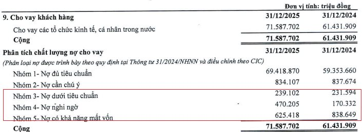 Trong đó, Nợ dưới tiêu chuẩn (nợ nhóm 3) tăng 3,24% lên 239,1 tỷ đồng; Nợ nghi ngờ (nợ nhóm 4) tăng 176,05% lên 470,2 tỷ đồng; Đặc biệt, Nợ có khả năng mất vốn (nợ nhóm 5) sụt giảm mạnh 25,43%, xuống 625,4 tỷ đồng.