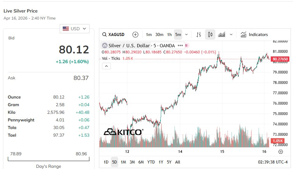 Trong tuần qua, bạc chứng kiến đà tăng giá mạnh khi vọt từ khoảng 73 USD/ounce lên 80 USD/ounce. Tại Việt Nam, giá bạc Phú Quý cũng tăng hơn 8% trong 7 phiên giao dịch gần nhất, đưa giá lên 82,8 triệu đồng/kg.