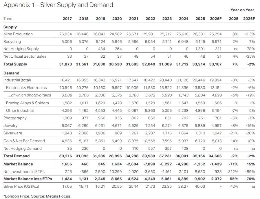 Kết thúc năm 2025, thị trường bạc ghi nhận tổng nhu cầu đạt 35,1 nghìn tấn, trong khi tổng nguồn cung đạt hơn 33,9 nghìn tấn tiếp tục ghi nhận năm thâm hụt thức 6 liên tiếp.