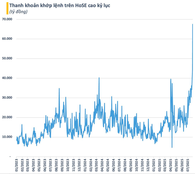 Thị trường chứng khoán Việt Nam vừa trải qua một phiên giao dịch sôi động chưa từng có trong lịch sử. Thanh khoản bùng nổ với giá trị khớp lệnh trên HoSE lên đến gần 67.000 tỷ đồng, cao nhất từ trước đến nay, gấp rưỡi so với mức kỷ lục cũ. Tính chung cả 3 sàn, tổng giá trị khớp lệnh lên đến gần 76.000 tỷ đồng (~3 tỷ USD).