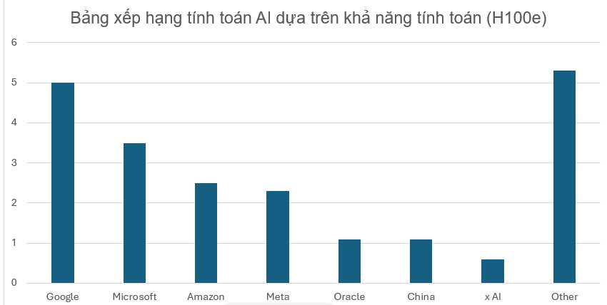 Đáng chú ý, toàn bộ các "ông lớn" dẫn đầu bảng xếp hạng đều là các tập đoàn của Mỹ. Thậm chí, theo ước tính của Epoch AI, tổng năng lực tính toán AI của toàn nước Trung Quốc hiện chỉ tương đương với sức mạnh của một doanh nghiệp đơn lẻ là Oracle.