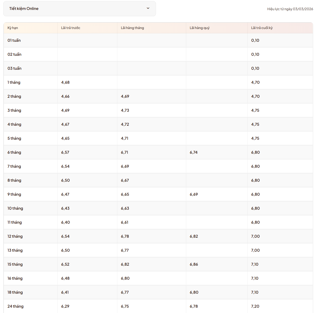 Khảo sát biểu lãi suất huy động mới nhất được Ngân hàng TMCP Lộc Phát Việt Nam (LPBank) công bố, hiệu lực từ ngày 3/3, cho thấy nhà băng này tiếp tục duy trì mặt bằng lãi suất cao ở nhiều kỳ hạn, đặc biệt là kênh tiền gửi trực tuyến. Theo đó, lãi suất cao nhất hiện đạt tới 7,2%/năm, áp dụng cho các khoản tiền gửi online kỳ hạn dài từ 24 tháng trở lên.