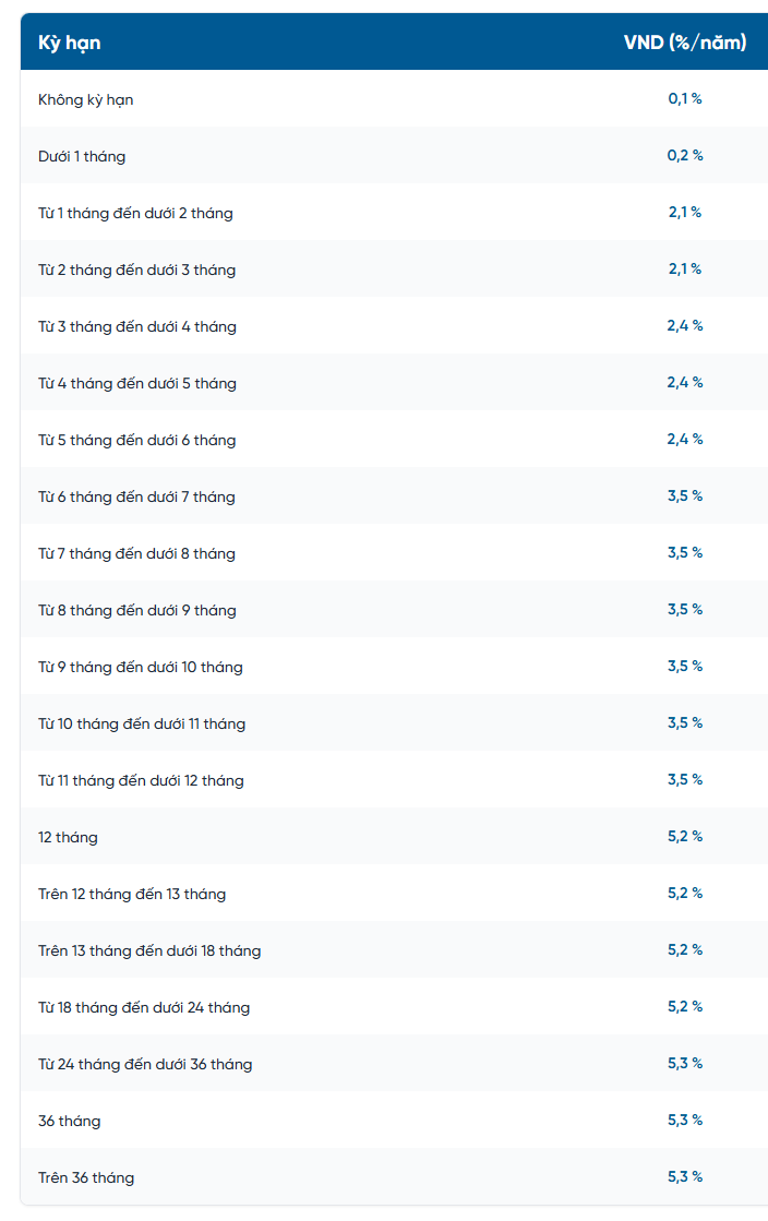 Ở nhóm kỳ hạn ngắn, lãi suất tiền gửi từ 1 tháng đến dưới 3 tháng hiện ở mức 2,1%/năm; các kỳ hạn từ 3 tháng đến dưới 6 tháng được niêm yết 2,4%/năm.