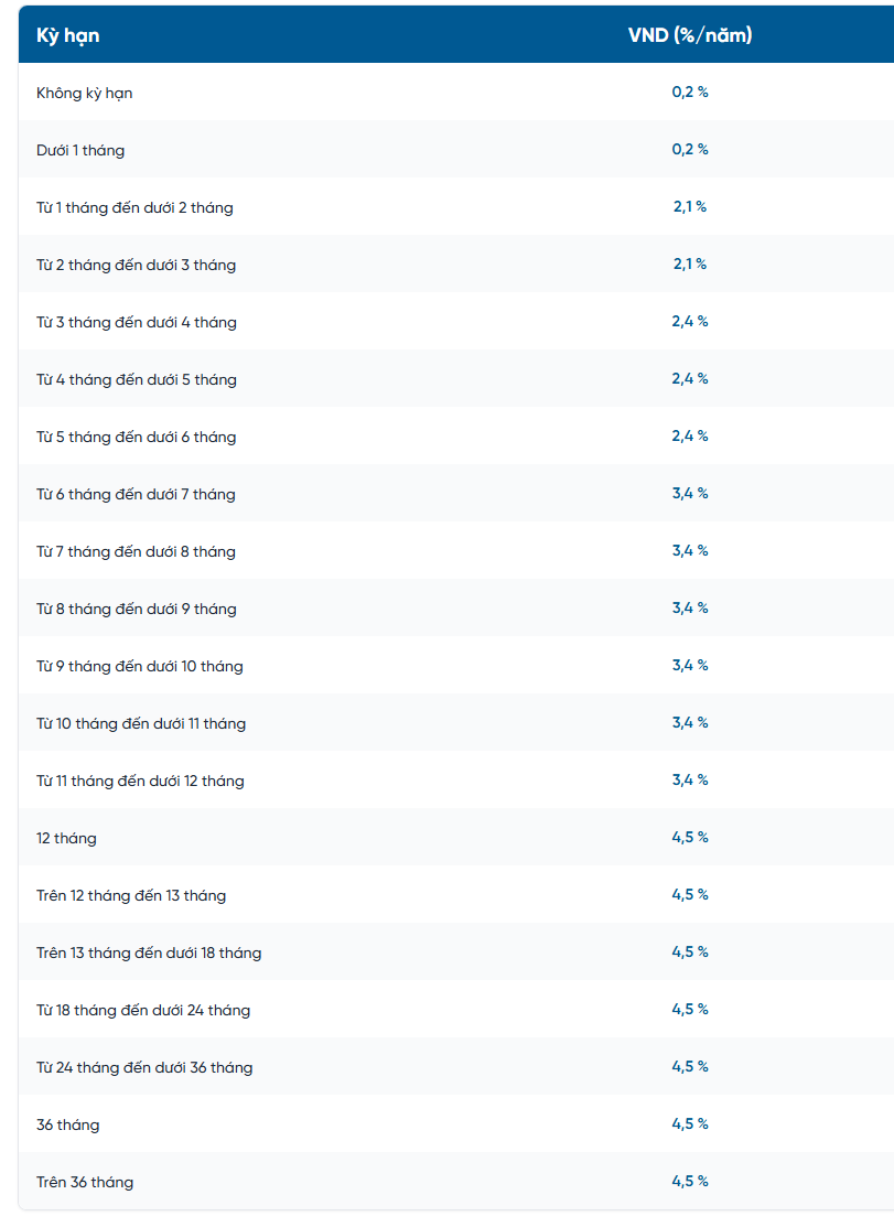 Đối với các khoản tiền gửi dài hạn, lãi suất được giữ ở mức cao nhất trong biểu niêm yết hiện hành. Cụ thể, các kỳ hạn từ 12 tháng trở lên, bao gồm 12 tháng, trên 12 đến dưới 13 tháng, trên 13 đến dưới 18 tháng, từ 18 đến dưới 24 tháng, từ 24 đến dưới 36 tháng, 36 tháng và trên 36 tháng, đều được áp dụng mức lãi suất 4,5%/năm.