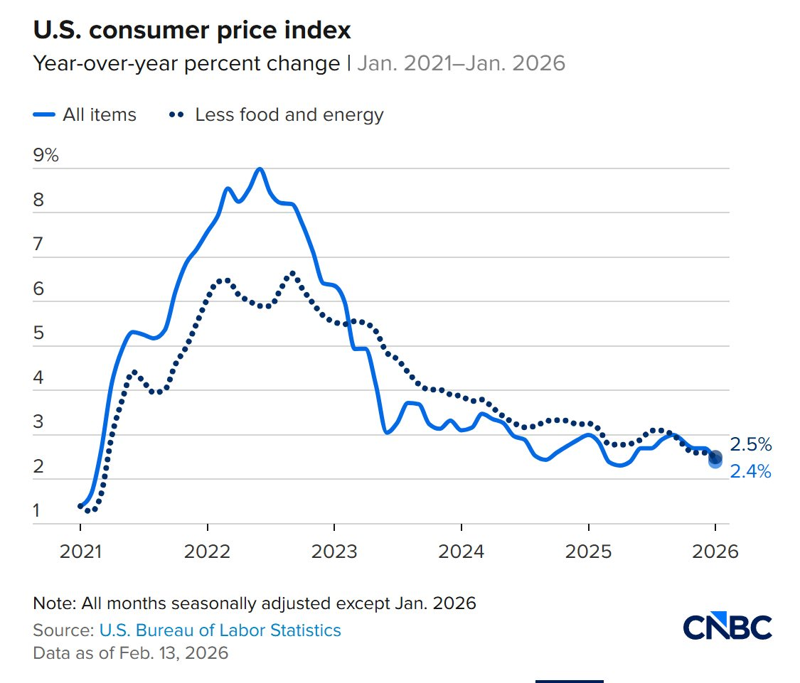 Theo Cục Thống kê Lao động Mỹ công bố hôm 13/2, chỉ số giá tiêu dùng (CPI) tháng 1 tăng 2,4% so với cùng kỳ năm trước. Mức này thấp hơn 0,3 điểm phần trăm so với tháng trước. Lạm phát quay về tương đương với tháng 5/2025, thời điểm sau khi Tổng thống Donald Trump công bố áp thuế mạnh tay đối với hàng nhập khẩu vào Mỹ vào tháng 4/2025.