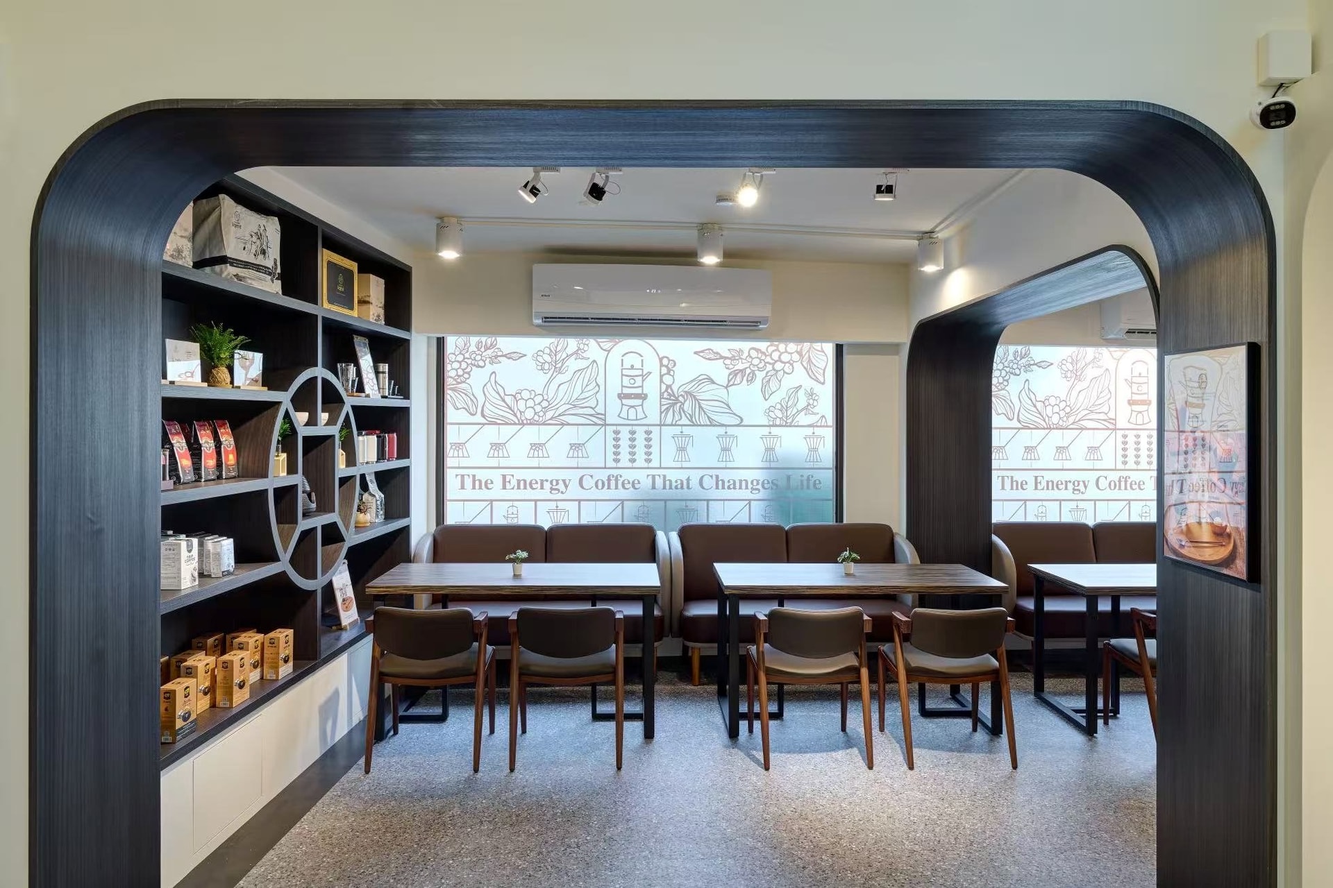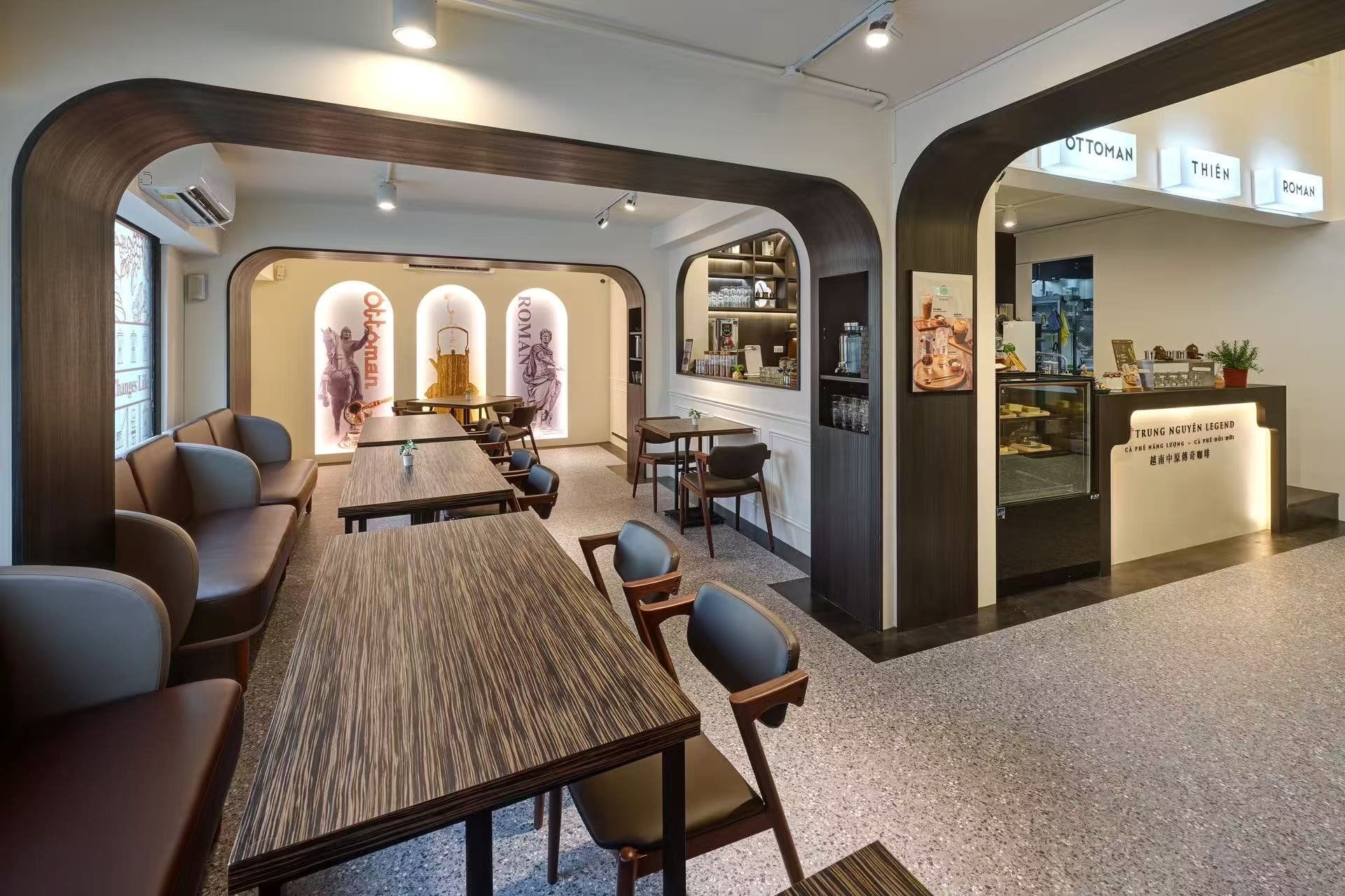 Bên trong, khách hàng sẽ được dẫn dắt qua ba nền văn minh cà phê – Ottoman, Roman và Thiền – tạo nên trải nghiệm đa tầng về thị giác, khứu giác và cảm xúc. Khu vực tầng 1 đặc biệt bố trí khu pha chế và trải nghiệm cảm quan, nơi khách có thể trực tiếp quan sát nghệ thuật pha cà phê phin Việt Nam truyền thống.