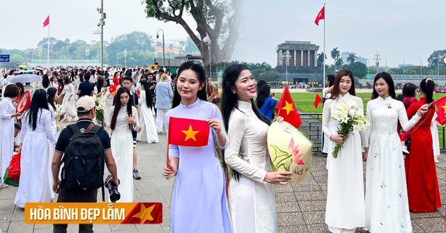 Đông nghịt người dân diện áo dài, cầm cờ hoa đổ về Lăng Bác ghi lại những khoảnh khắc đầy tự hào trước thềm 30.4