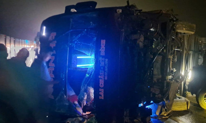 Tại hiện trường, chiếc xe khách bị lật nằm chắn ngang mặt đường, kính lái vỡ, phần thân xe hư hỏng. Một số hạng mục an toàn giao thông như hộ lan, tôn sóng bị ảnh hưởng.