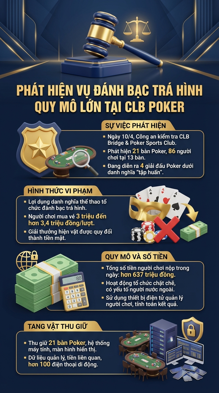 Hoạt động tổ chức được điều hành chặt chẽ, có sự tham gia của nhiều đối tượng người nước ngoài, phân công vai trò cụ thể từ quản lý, thu ngân, chia bài đến điều phối giải đấu. Tại hiện trường, lực lượng Công an ghi nhận hệ thống vận hành chuyên nghiệp, sử dụng thiết bị điện tử để quản lý người chơi, tính toán kết quả và kiểm soát dòng tiền, cho thấy tính chất tinh vi, có yếu tố nước ngoài tham gia điều hành.