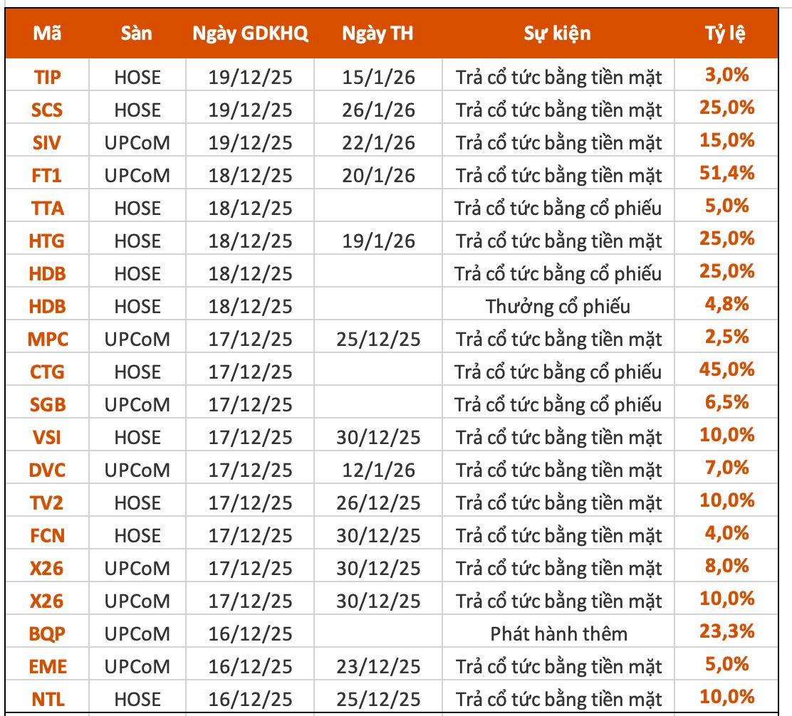 Theo thống kê, có 20 doanh nghiệp thông báo chốt quyền cổ tức trong tuần 15/12– 19/12. Trong đó, 14 doanh nghiệp trả cổ tức bằng tiền mặt trong tuần này, mức cao nhất là 51,4% và thấp nhất là 2,5%.