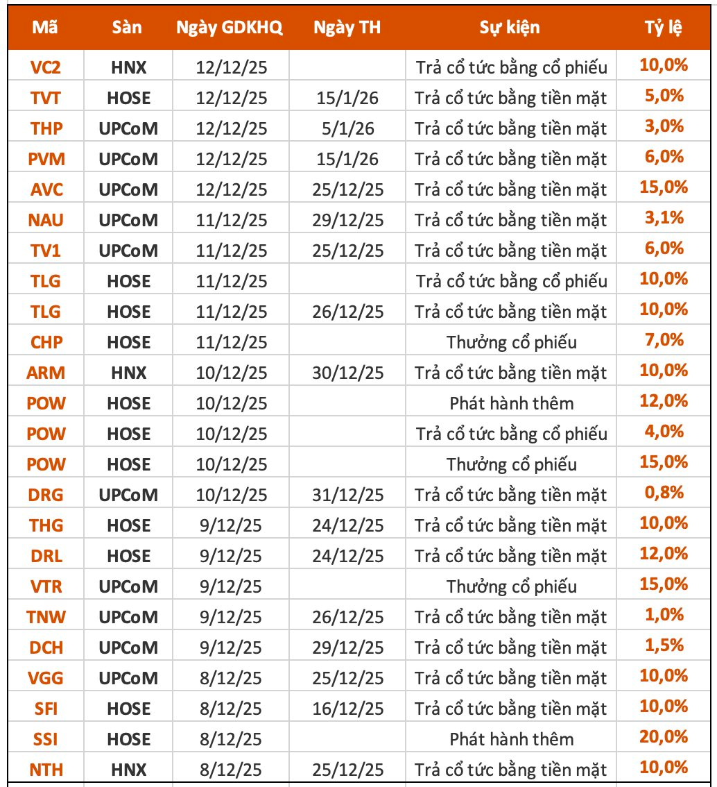 Theo thống kê, có 24 doanh nghiệp thông báo chốt quyền cổ tức trong tuần 8/12– 12/12. Trong đó, 16 doanh nghiệp trả cổ tức bằng tiền mặt trong tuần này, mức cao nhất là 15% và thấp nhất là 1%.