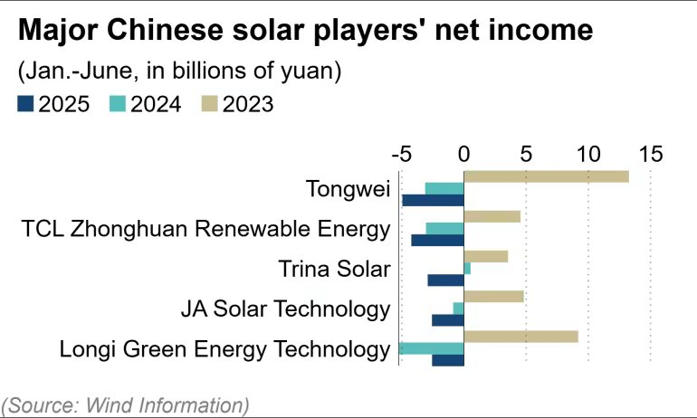 Theo các báo cáo mới nhất gửi lên sàn chứng khoán, năm liên minh hàng đầu bao gồm TCL Zhonghuan Renewable Energy, Trina Solar, Longi Green Energy Technology, JA Solar Technology và Tongwei đang dự báo tổng mức lỗ ròng dao động từ 34,2 tỷ đến 38,4 tỷ USD cho năm 2025.