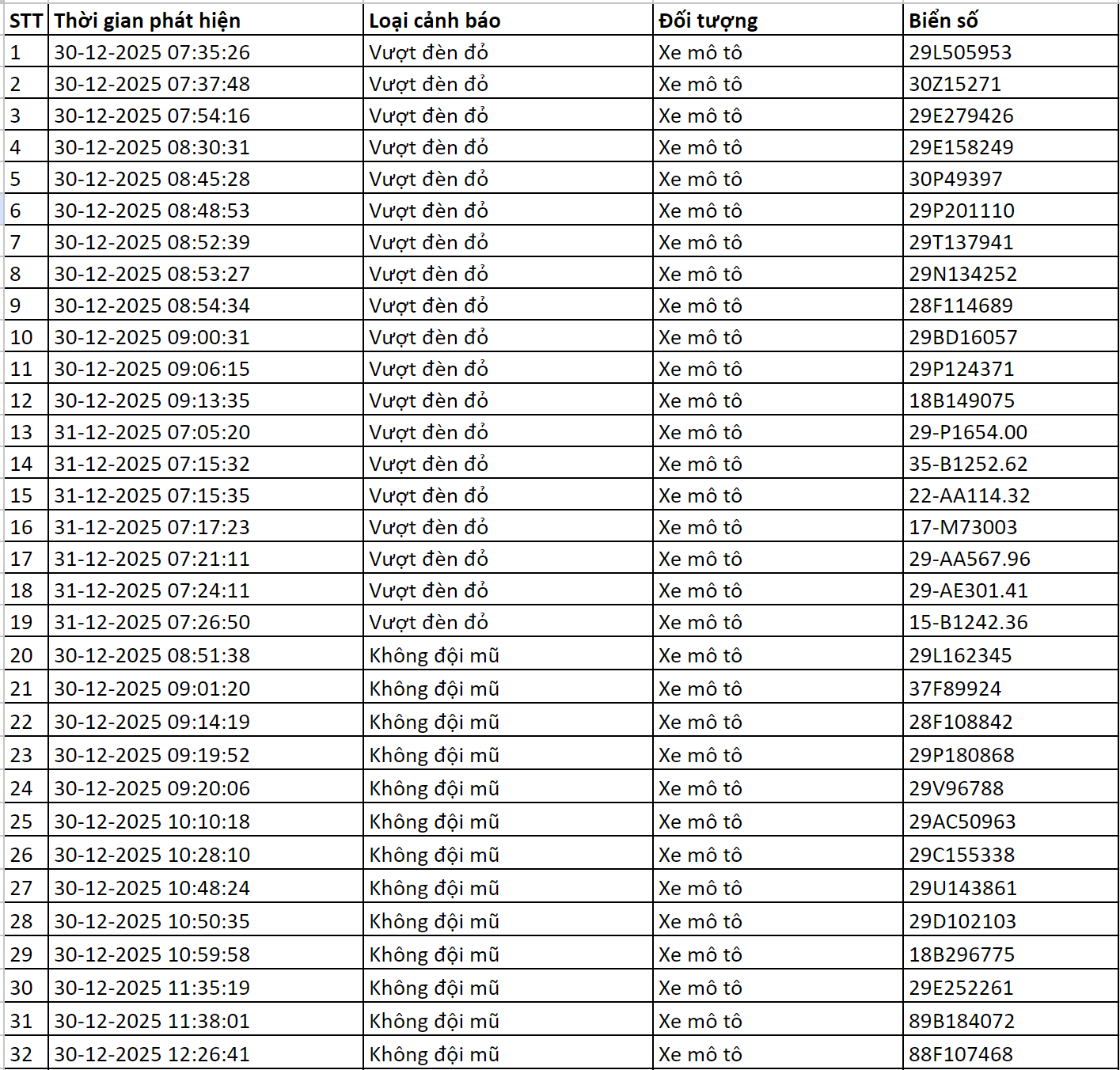 Trong ngày 31/12/2025, Cục Cảnh sát giao thông đã xác định thêm nhiều trường hợp vi phạm trật tự an toàn giao thông qua hệ thống camera A.I.