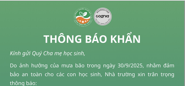 Trường Phổ thông Liên cấp Đa trí tuệ thông báo sẽ mở cửa các phòng học để học sinh ngồi chờ phụ huynh đến đón muộn và chuẩn bị bữa ăn cho các em. Học sinh, giáo viên và nhân viên nhà trường không thể di chuyển về nhà do ảnh hưởng của thời tiết, trường bố trí phòng ngủ qua đêm ngày 30/9.