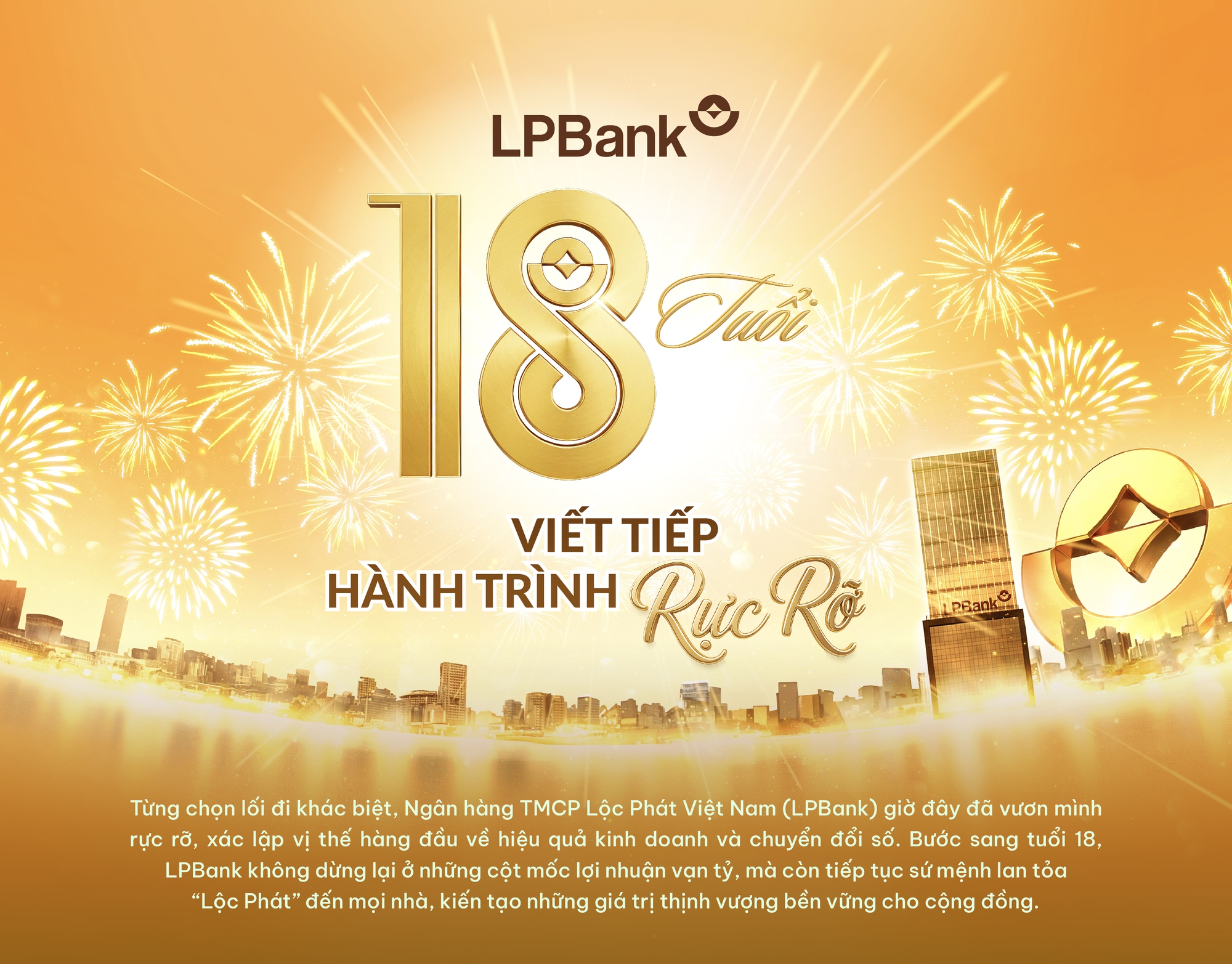 Ở tuổi 18, LPBank không chỉ đạt đến một cột mốc mang tính biểu tượng. Hành trình rực rỡ gần hai thập kỷ qua đã giúp Ngân hàng xây dựng được một nền tảng đủ lớn và vững chắc để tiếp tục tăng tốc. Bước vào chu kỳ phát triển mới, LPBank mang theo những khát vọng lớn lao hơn, đối mặt với những tiêu chuẩn khắt khe hơn về hiệu quả, năng lực công nghệ và tính bền vững. Với tinh thần luôn tiến về phía trước, LPBank đã sẵn sàng khẳng định vai trò tiên phong trong hệ thống ngân hàng Việt Nam, liên tục đổi mới để kiến tạo những giá trị thực, thịnh vượng và bền vững cho tương lai.