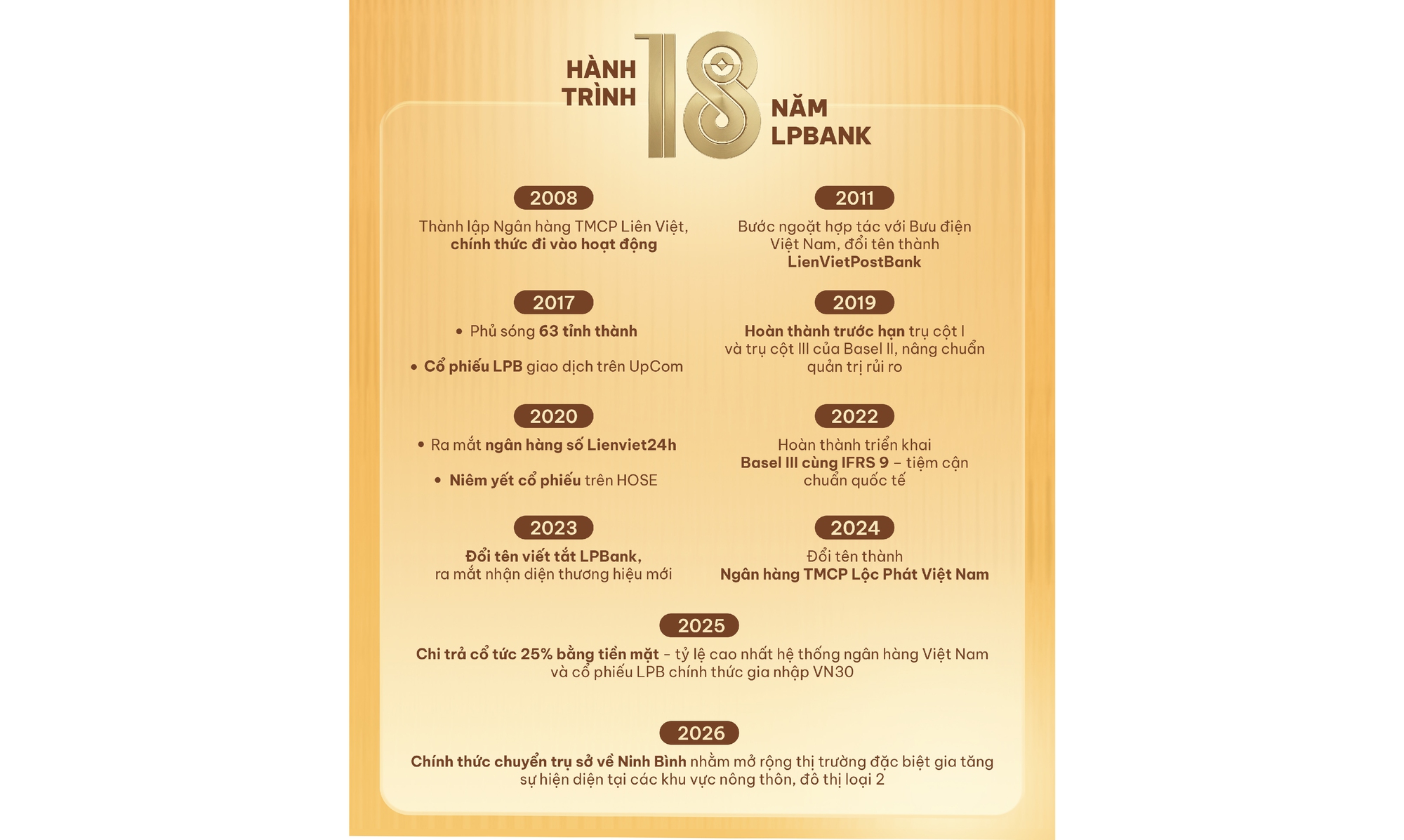 Ra đời giữa thời điểm thị trường tài chính phân hóa mạnh mẽ, LPBank kiên định lộ trình mở rộng quy mô, tối ưu hiệu quả và tiên phong trong cuộc đua chuyển đổi số để xác lập vị thế riêng biệt. Vì vậy, hành trình 18 năm, không đơn thuần là một mốc thời gian, mà là biểu tượng của sự trưởng thành và những bước bứt phá không ngừng nghỉ của một ngân hàng luôn mang khát vọng vươn xa.