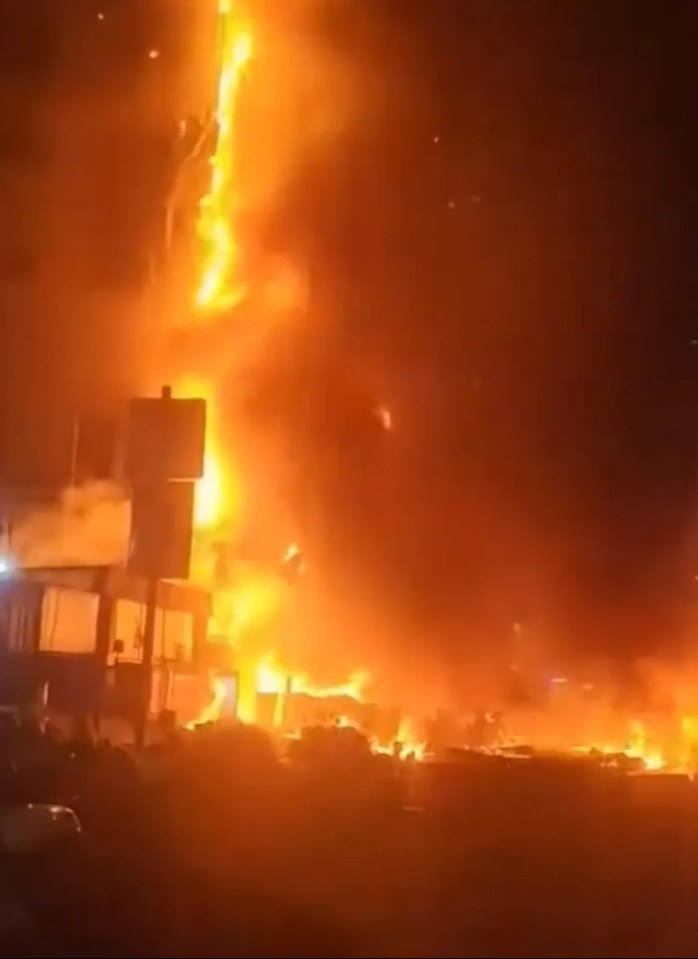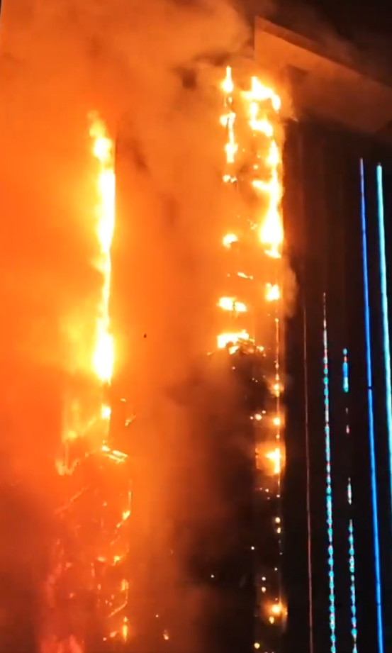 Các đoạn video ghi lại hiện trường cho thấy ngọn lửa đỏ rực nuốt chửng tòa tháp, trong khi cột khói đen khổng lồ cuồn cuộn bốc cao lên bầu trời. Nhiều mảnh vỡ cháy dở rơi xuống đường, khiến người dân xung quanh hoảng loạn.