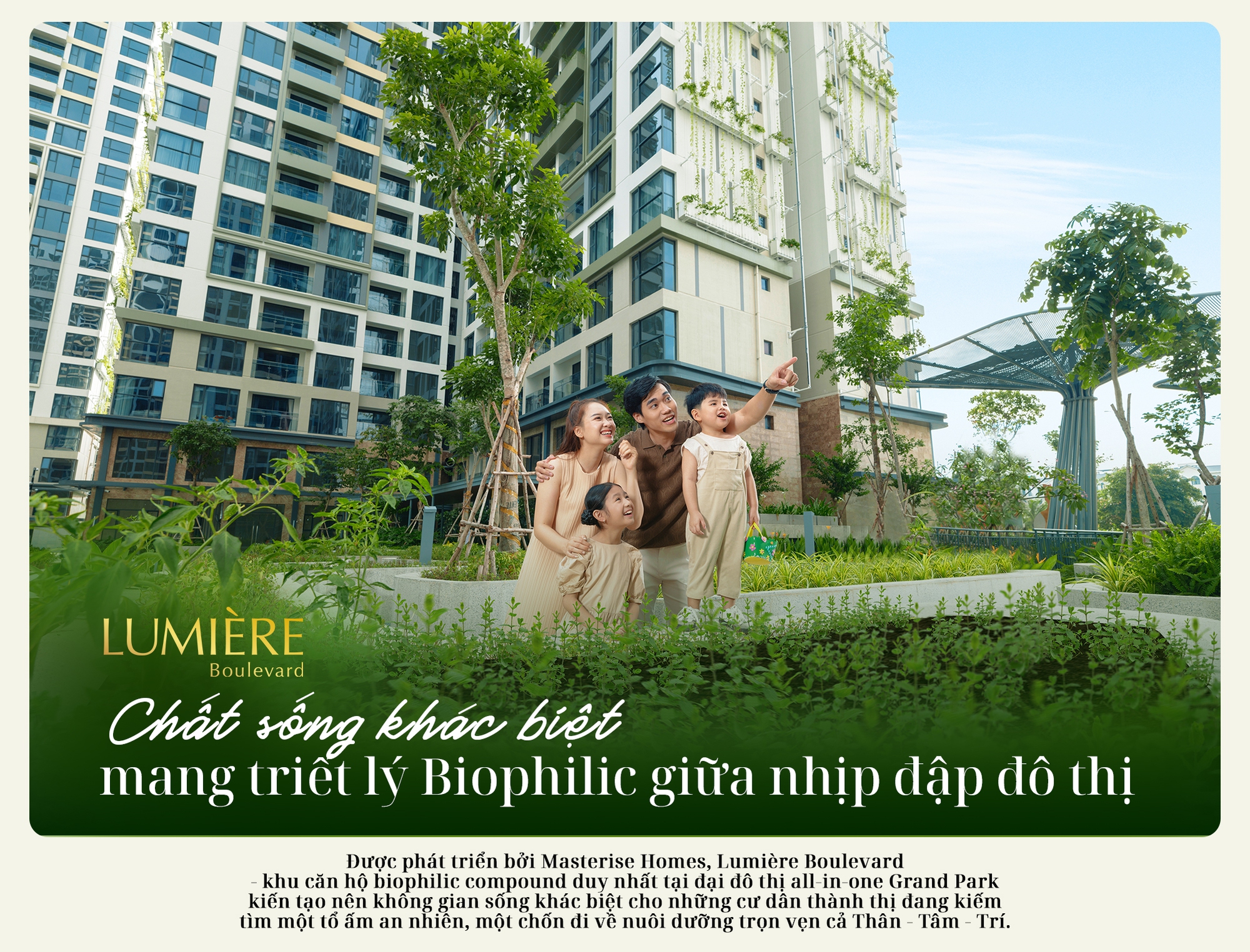 Ngay khu Đông TP.HCM, dấu ấn của triết lý Biophilic được thể hiện một cách trọn vẹn và duy mỹ tại Lumière Boulevard - khu compound mang phong cách biophilic duy nhất giữa lòng đại đô thị Grand Park sầm uất, mang đến một trải nghiệm sống khác biệt cho những cư dân thành thị đang tìm kiếm một không gian sống an nhiên, một chốn về nuôi dưỡng trọn vẹn cả Thân - Tâm - Trí.