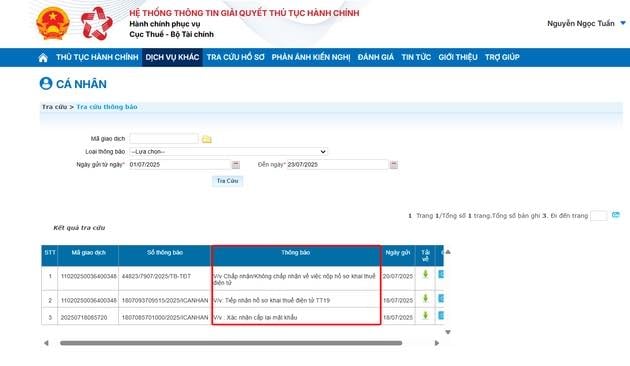 Sau khi nộp tờ khai thành công, tiến hành tra cứu thông báo để xác nhận.