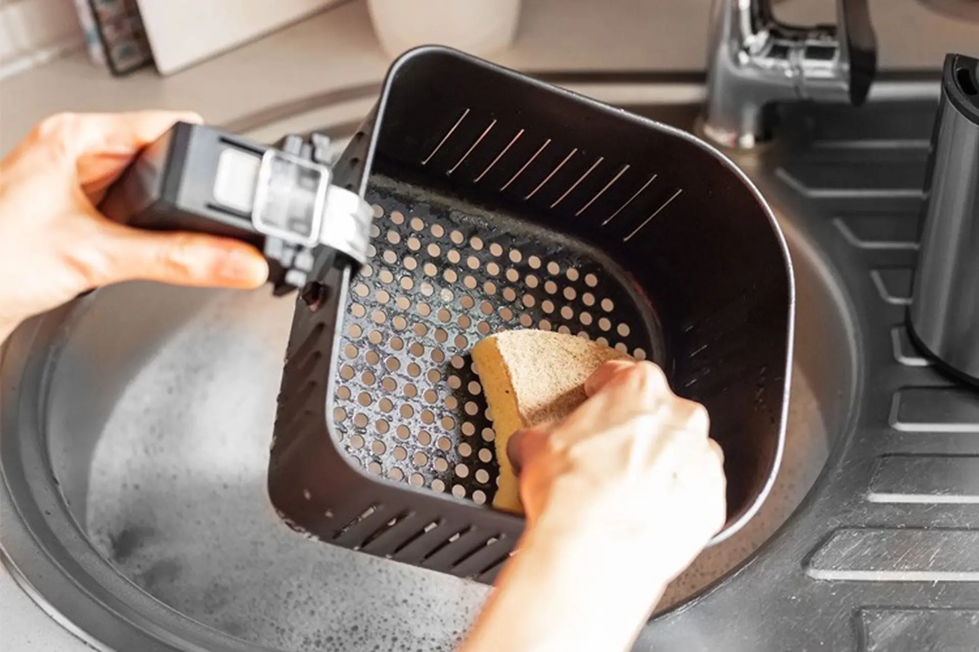 Khay và rổ chiên của nồi thường được phủ lớp chống dính, vì vậy nếu dùng búi kim loại hoặc miếng cọ quá cứng sẽ dễ làm trầy xước bề mặt. Khi lớp chống dính bị hỏng, thức ăn sẽ dễ bám dính hơn trong những lần sử dụng sau. Bạn chỉ nên dùng miếng rửa mềm, kết hợp với nước rửa chén thông thường.