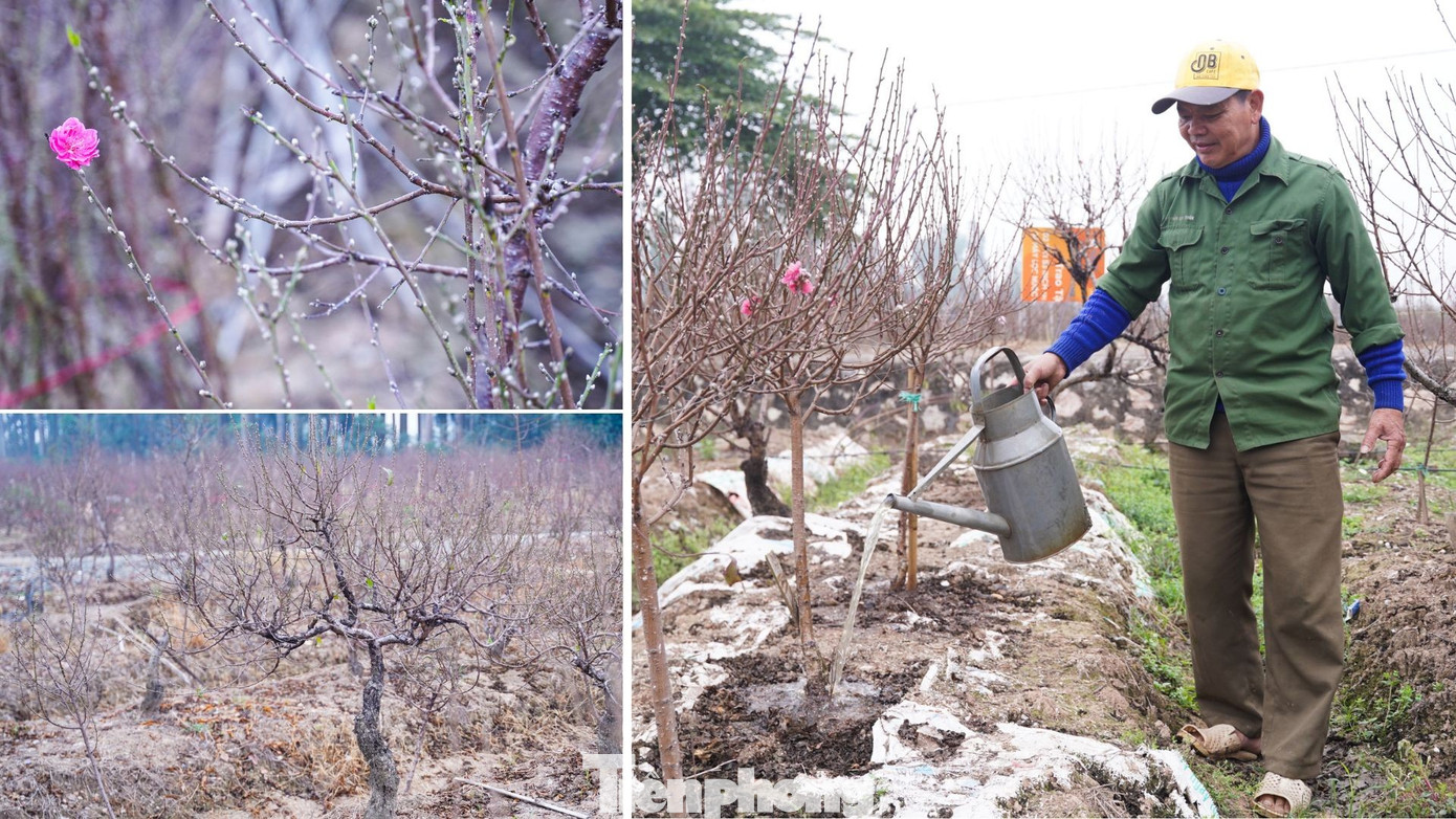 Trên các ruộng đào, nhiều cây hoa mới chỉ lác đác nở, phần lớn số cây đào vẫn được người dân giữ nụ, chăm sóc cẩn thận để canh đúng thời điểm bung hoa.