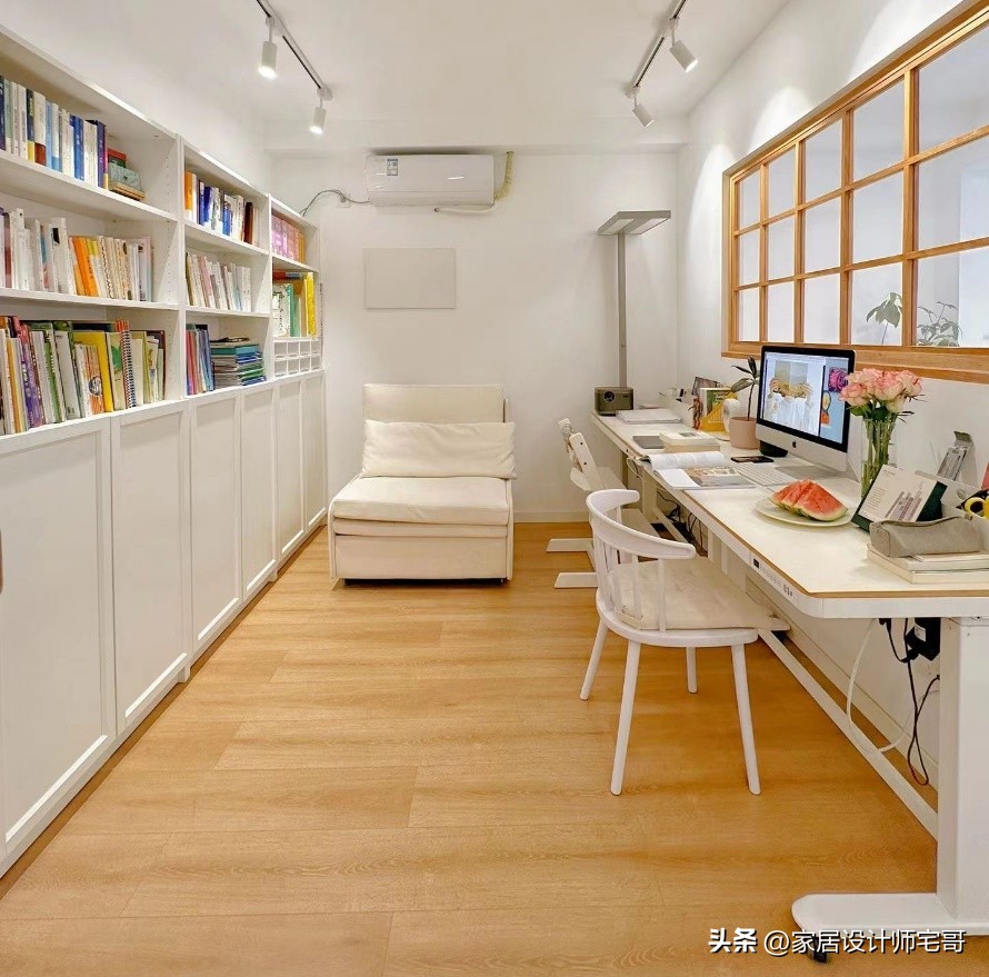 Hai bàn làm việc có thể điều chỉnh chiều cao giúp cả mẹ và con sử dụng linh hoạt. Giá sách lớn đặt sát tường cung cấp thêm không gian lưu trữ sách và đồ thủ công, giúp căn nhà nhỏ nhưng không bị bừa bộn.
