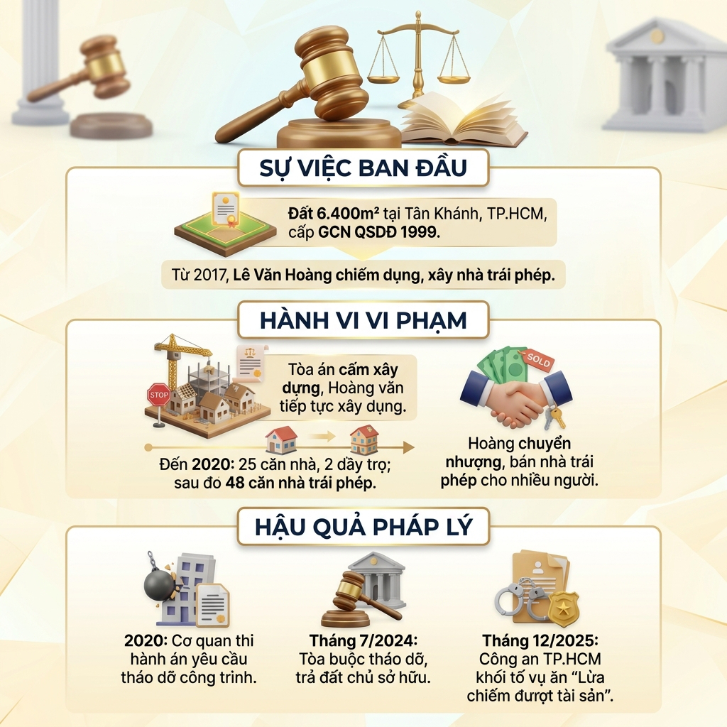 Theo hồ sơ, khu đất có diện tích hơn 6.400m² tại phường Tân Khánh (Thành phố Hồ Chí Minh) đã được cấp giấy chứng nhận quyền sử dụng hợp pháp cho ông Trương Minh Ký từ năm 1999. Tuy nhiên, từ năm 2017, Lê Văn Hoàng cùng một số cá nhân đã chiếm dụng một phần diện tích đất này để xây dựng nhà ở trái phép, dẫn đến tranh chấp kéo dài. Mặc dù chủ đất đã khởi kiện và Tòa án áp dụng biện pháp khẩn cấp tạm thời, cấm xây dựng trên khu đất, nhưng các công trình vẫn tiếp tục mọc lên.
